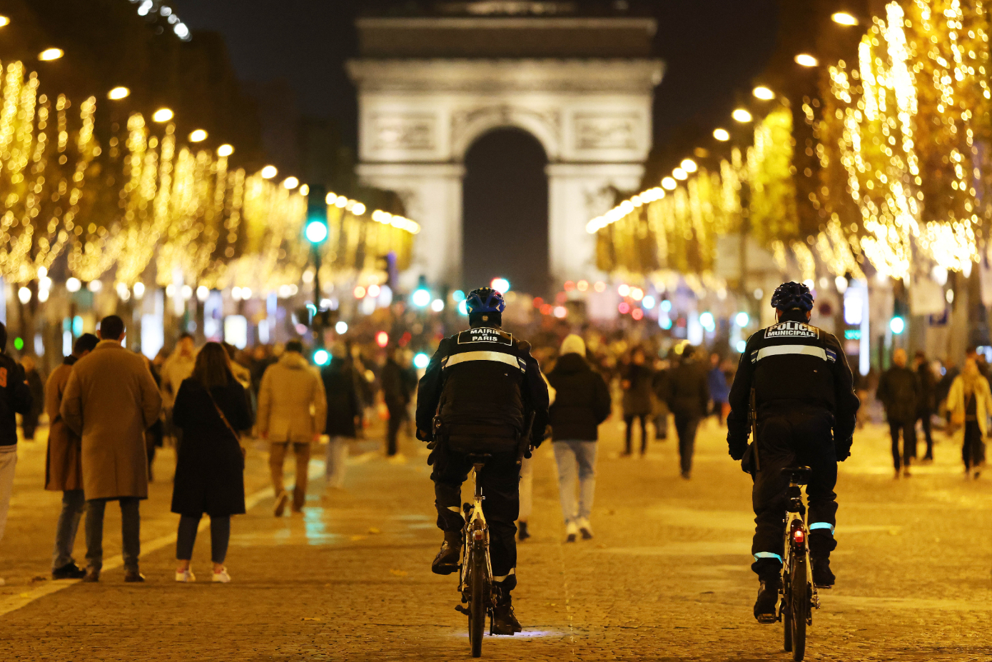 警察在点灯后的法国巴黎香榭丽舍大街上巡逻。