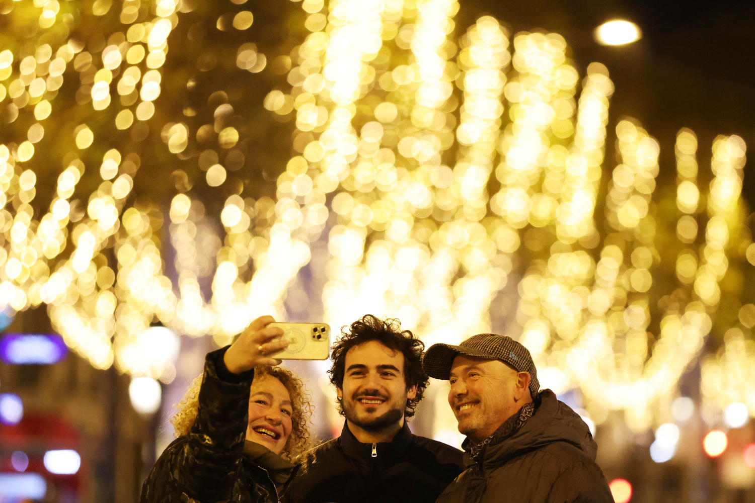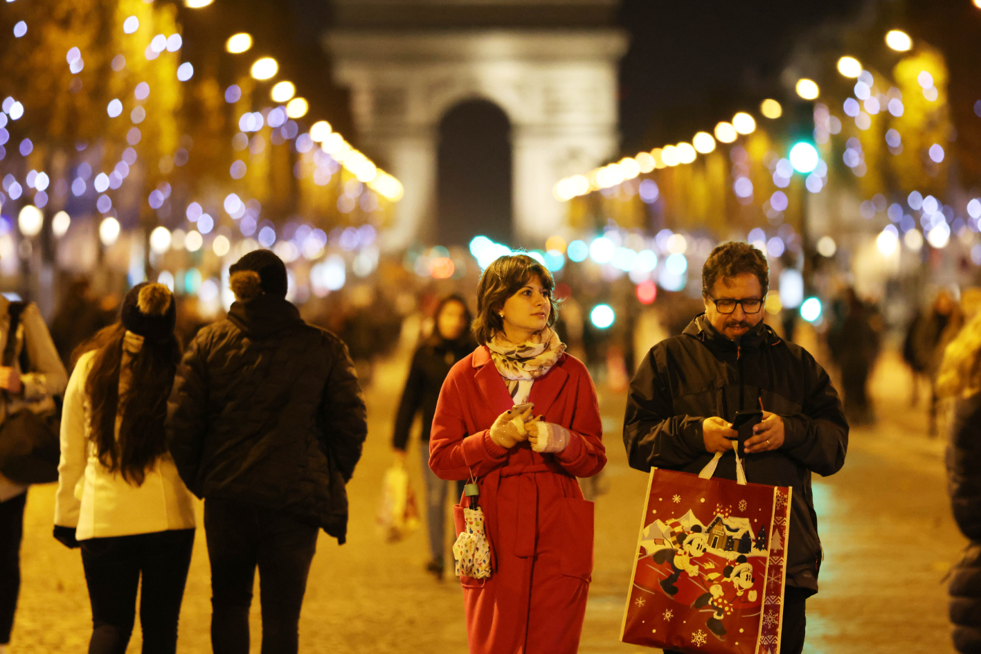 民众在法国巴黎香榭丽舍大街上欣赏节日灯饰。