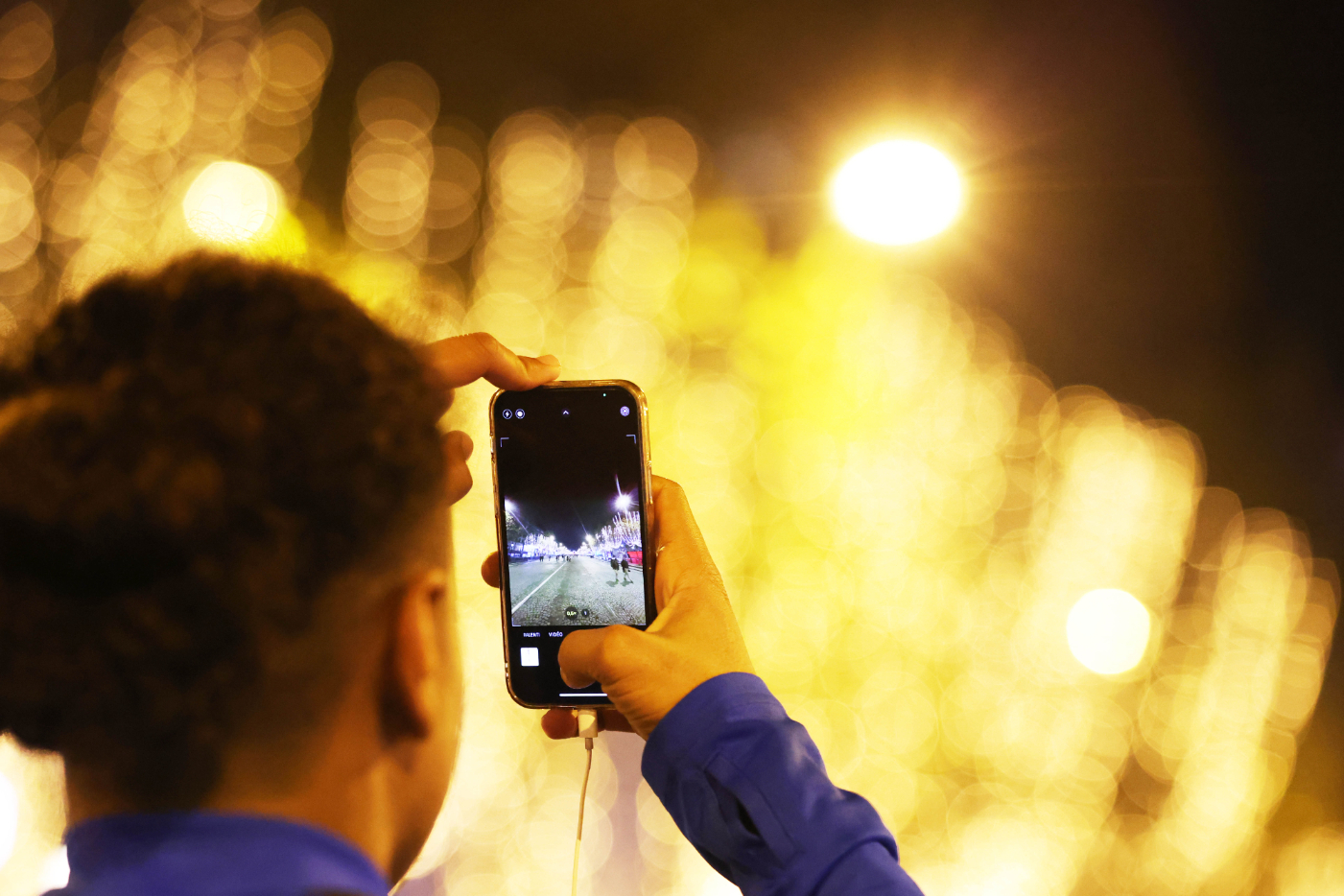 一名男子在法国巴黎香榭丽舍大街上拍摄节日灯饰。