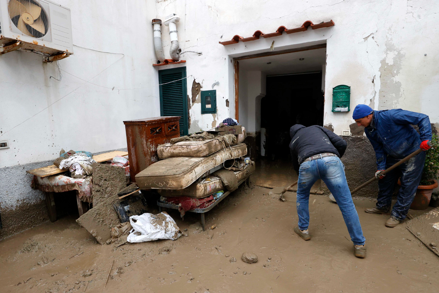 图为人们在意大利伊斯基亚岛清理受灾的房屋。