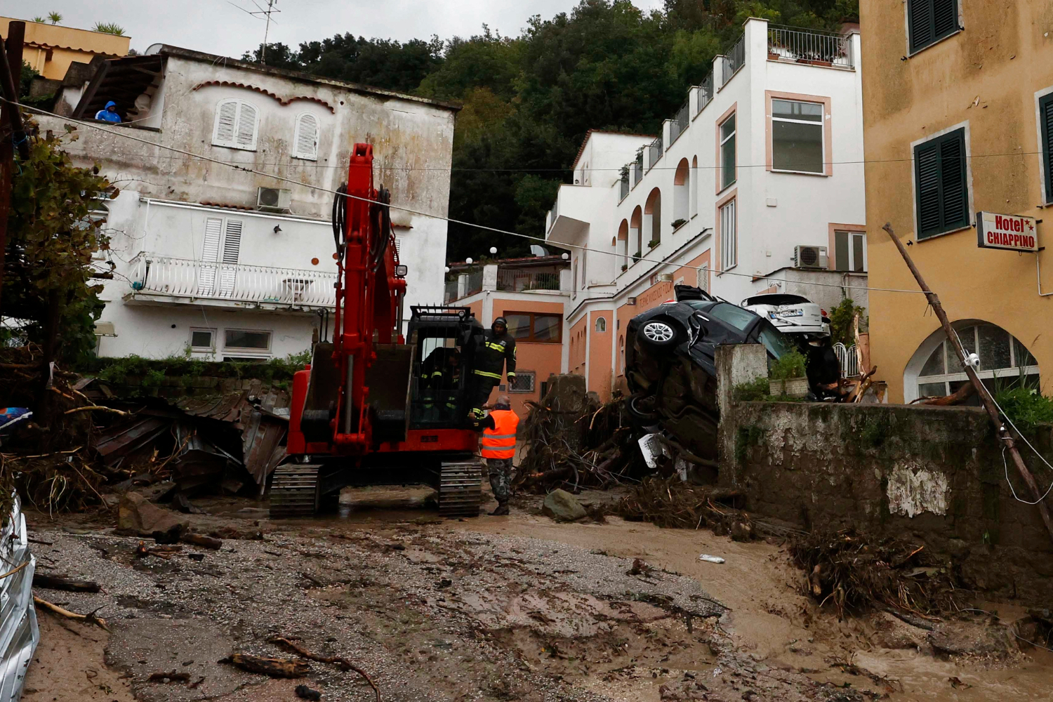 工作人员在意大利伊斯基亚岛受灾的路面上工作。