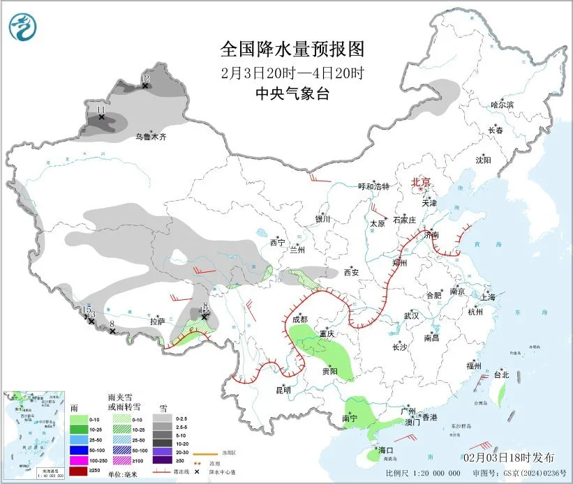图2 全国降水量预报图(2月3日20时-4日20时)