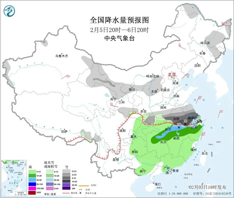 图4 全国降水量预报图(2月5日20时-6日20时)