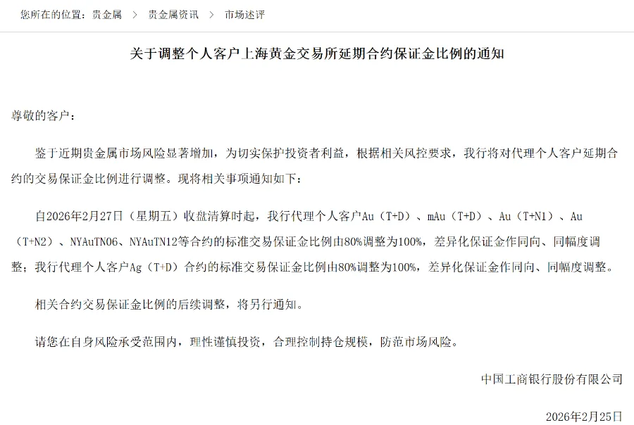 2月25日,农业银行发布《关于代理上海黄金交易所个人贵金属交易业务调整延期合约保证金比例的通知》。通知称,近期国际贵金属市场价格波动加剧,个人客户交易类贵金属业务市场风险上升。为切实保护投资者利益,自2026年2月26日收盘清算时起,Au(T+D)、mAu(T+D)、Ag(T+D)合约的保证金比例从80%调整为100%。