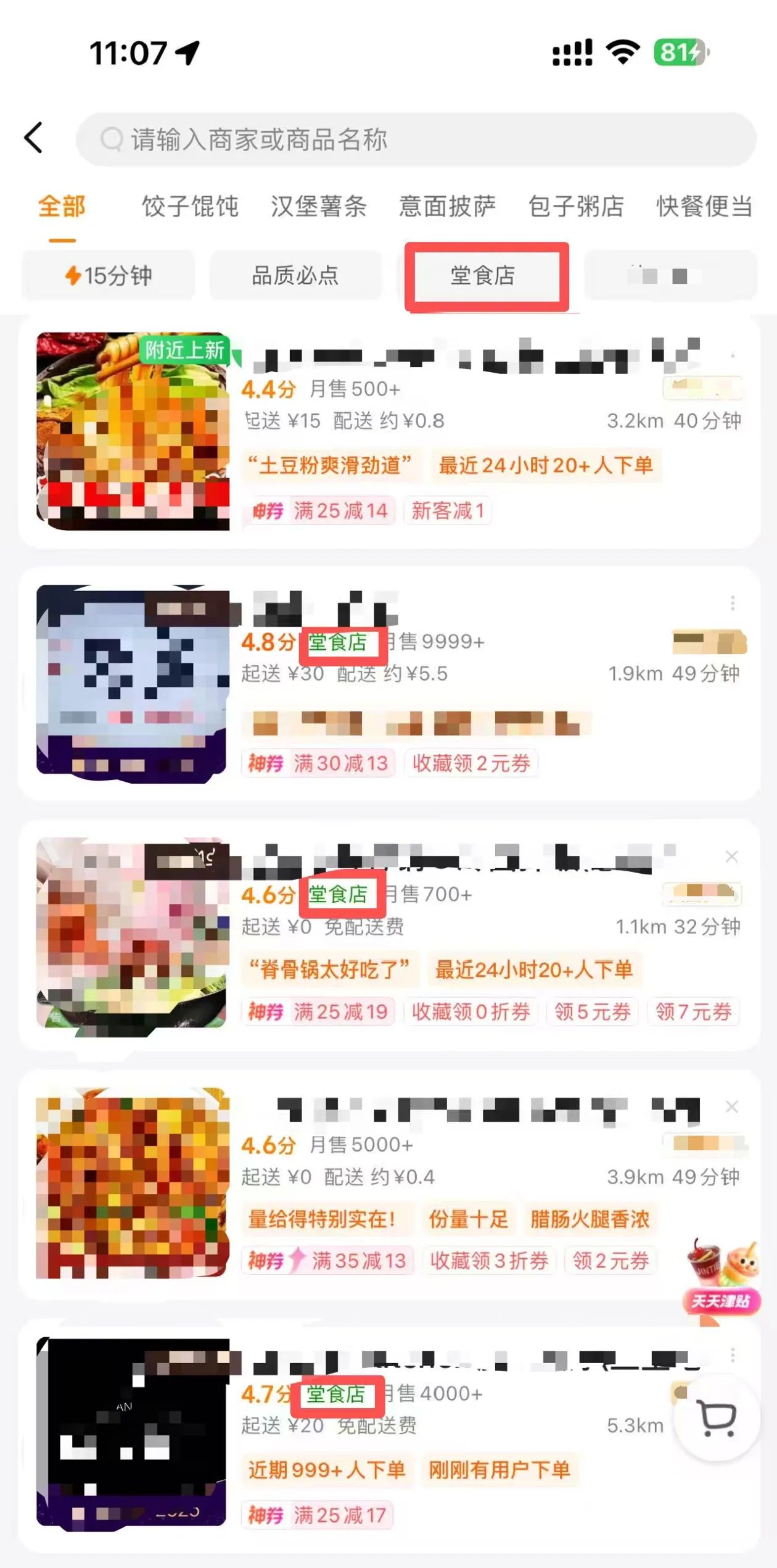 在商家列表页,仔细看店铺名称旁边或下方。