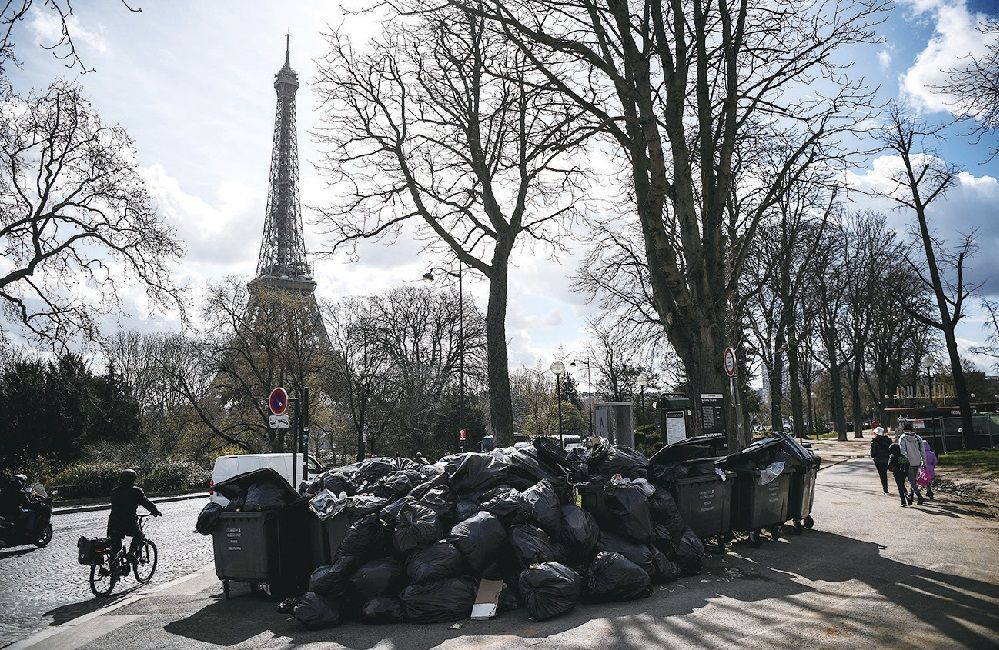 图为3月15日巴黎埃菲尔铁塔附近堆积的垃圾。法新社图