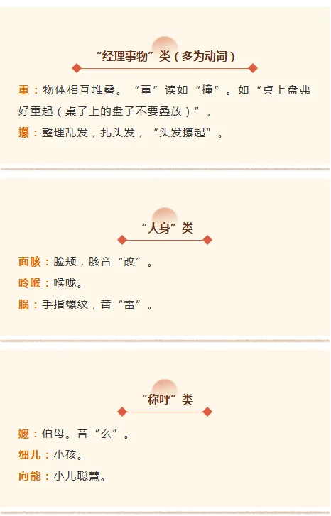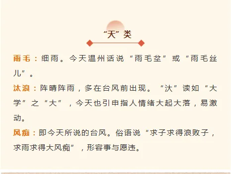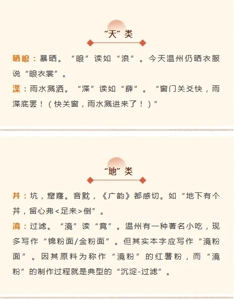 这些温州方言著作,以《俗字编》为代表,多采取分类列词,并加以释义的体例。分为“天、地、时序……”类目,每个类目下列出若干词条,并加以注音和释义。这其中记录的大部分词条,已与今天的温州方言相合。证明至少239年前,温州方言的整体面貌已与今天相差无几。下面,我们先以《俗字编》为例,列举一些这样的词例。
