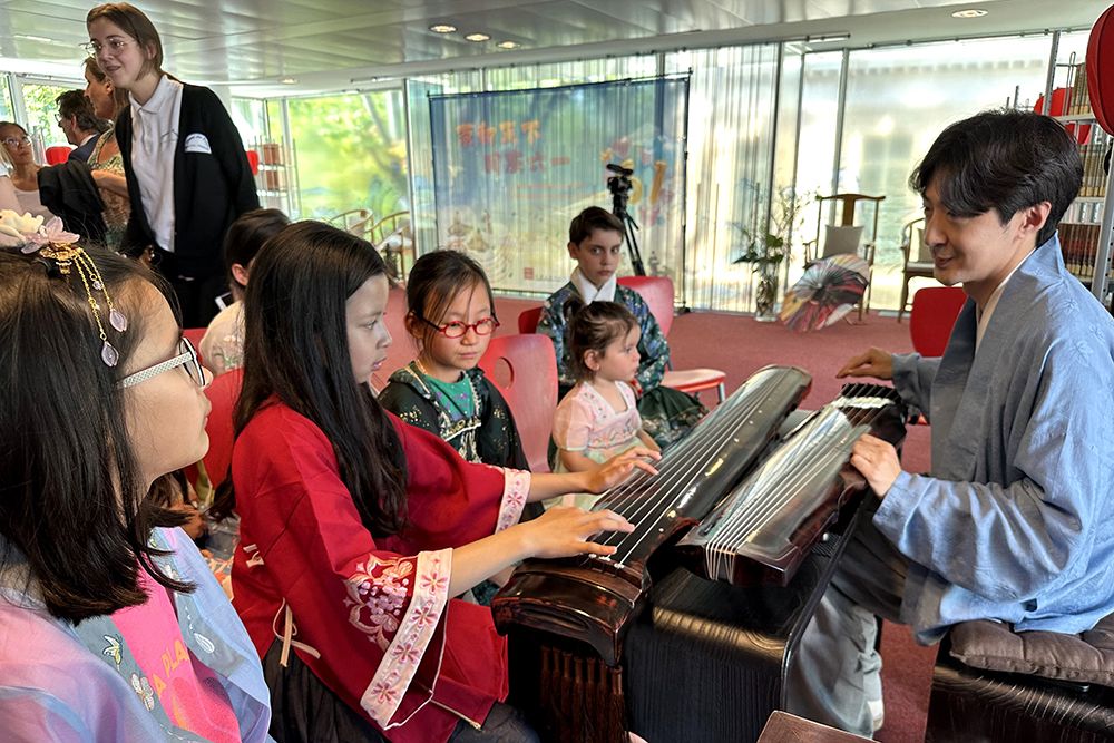 在古琴启蒙区,琴艺师向小朋友们展示古琴技艺。(图片来源:本文图片均据中新社)