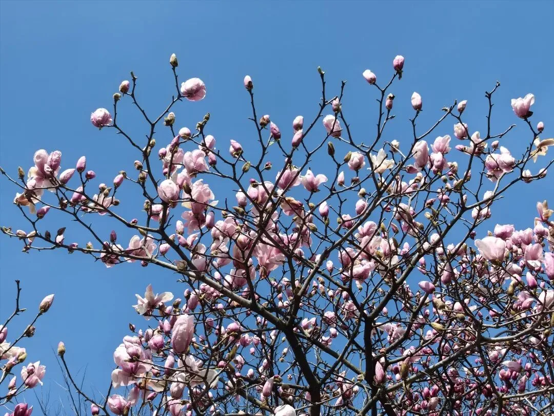 粉玉兰次第舒展,浅粉盈枝、瓣润如霞,清风拂过暗香浮动,漫步其间尽是春日温柔浪漫。