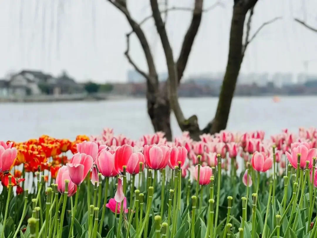春风有信,花开三垟。西环线的郁金香沿河盛放,姹紫嫣红,千花百态,与潋滟水光交织成诗,令人沉醉忘返。