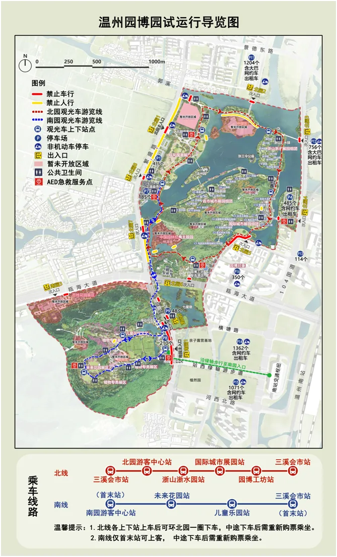 游览过程中,点击“试运行导览图”,试运行阶段的南、北园可游玩线路一目了然,“游玩地图”功能更是游客游园的得力助手。打开地图,园区的交通站点、出入口、停车场、景观、展园、候车廊、公厕等关键点位均被精准标注,并提供定位导航服务,真正实现“一图在手,畅游园博”。