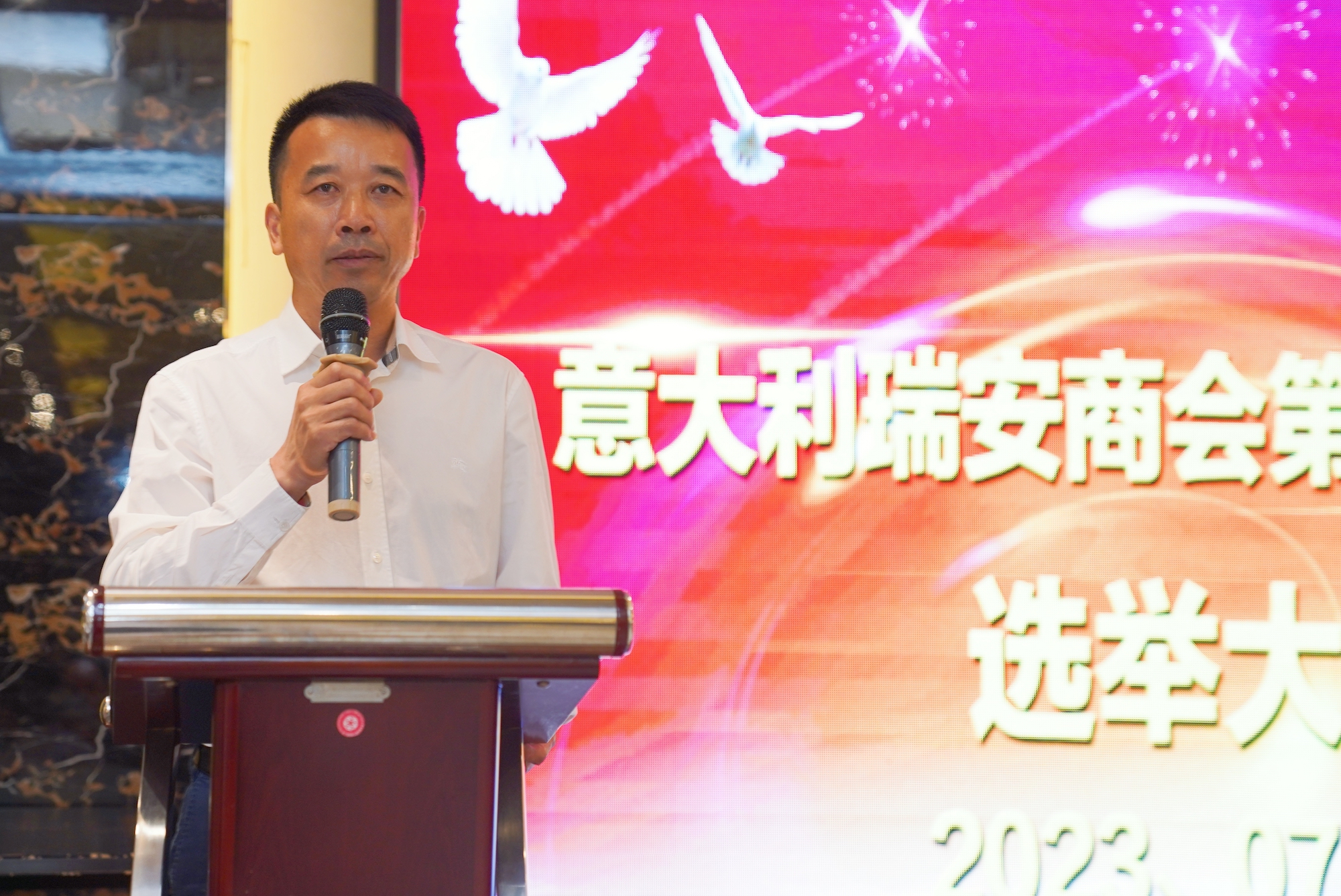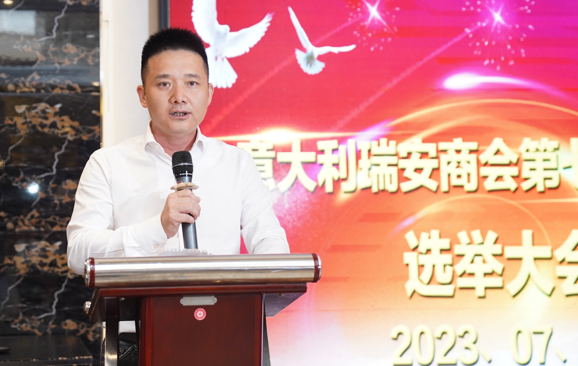 经过意大利瑞安商会理事会全体成员鼓掌通过后,新任第七届会长林瑞诞发表了就职感言,首先,我要向卢锡华会长以及出席今晚选举大会的商会同仁表示最诚挚的谢意。感谢大家的信任,一致推选我担任意大利瑞安商会第七届理事会会长,我深感荣幸和责任重大。在这个历史性的时刻,我再次向大家表示衷心的感激和诚挚的祝福。