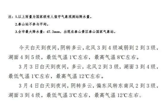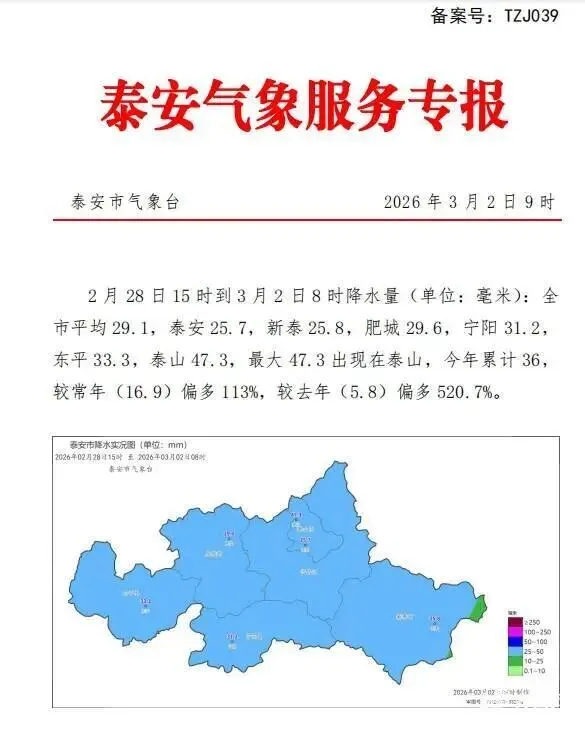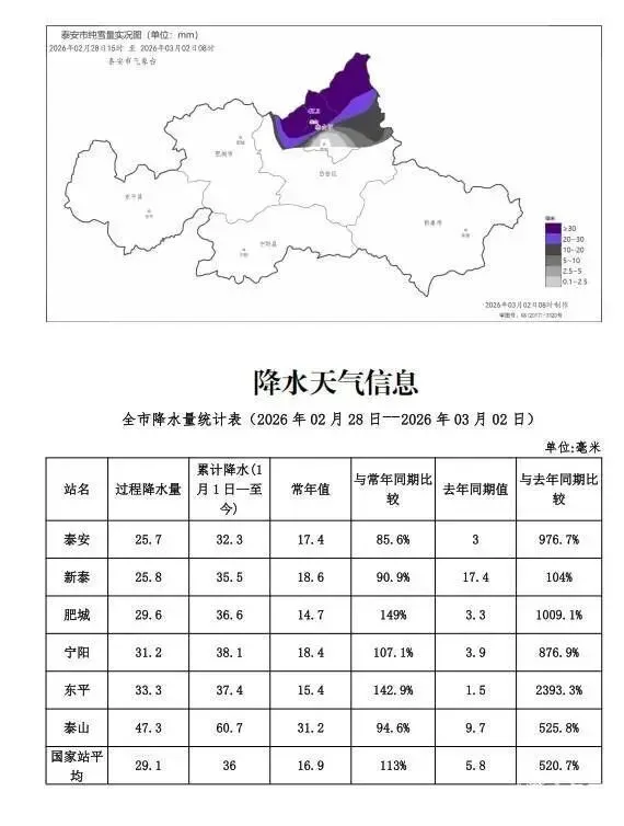2月28日15时到3月2日8时降水量(单位:毫米):全市平均降水量29.1,泰安25.7,新泰25.8,肥城29.6,宁阳31.2,东平33.3,泰山47.3,最大47.3出现在泰山,今年累计36,较常年(16.9)偏多113%,较去年(5.8)偏多520.7%。