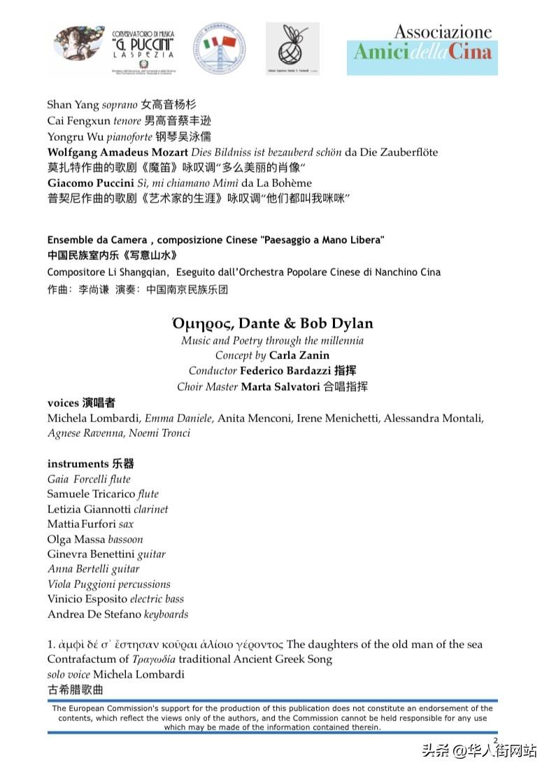 音乐会由拉斯佩齐亚普契尼音乐学院教授和学生们演奏了舒伯特和肖斯塔科维奇的四重奏作品和普音中国学生:女高音杨杉、男高音蔡丰逊、钢琴吴泳儒,他们先后演唱了莫扎特、威尔第和普契尼的歌剧咏叹调,再有拉市艺术高中的老师和学生们演奏和演唱了古希腊歌曲及鲍勃·迪伦、平克·弗洛伊德、尼尔杨等作品。