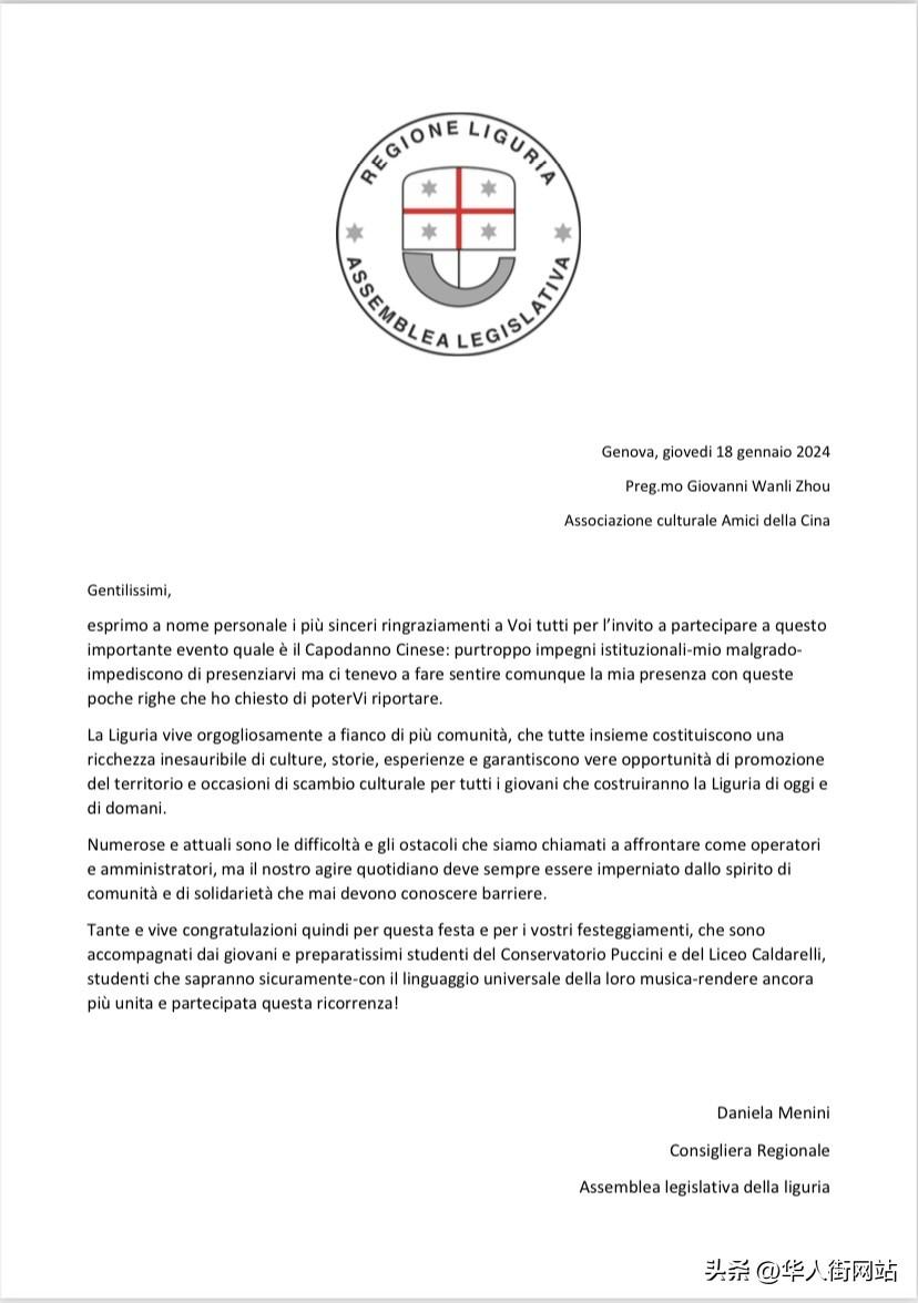 再有中国驻佛罗伦萨总领馆管仲奇代总领事致辞,管代总领事说:首先向到场嘉宾和广大侨胞致以春节问候,对当地政府长期以来对中国社区的大力支持表示感谢。他强调,2024年是中意建立全面战略伙伴关系20周年及马可波罗逝世700周年,希望拉市同友城珠海市、南宁市、南京市不断加深往来,推动经贸、文化等领域务实合作取得新的成绩,进一步促进中意交流互鉴、民心相通,推动构建人类命运共同体。