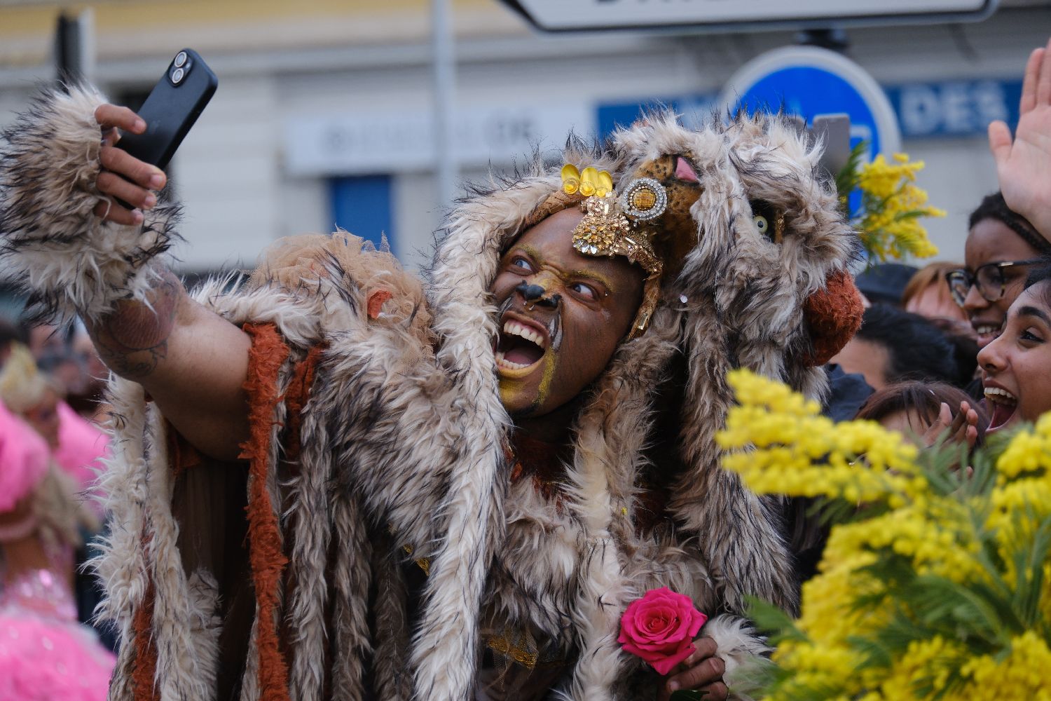 3月2日,演员在法国尼斯狂欢节上与观众自拍。