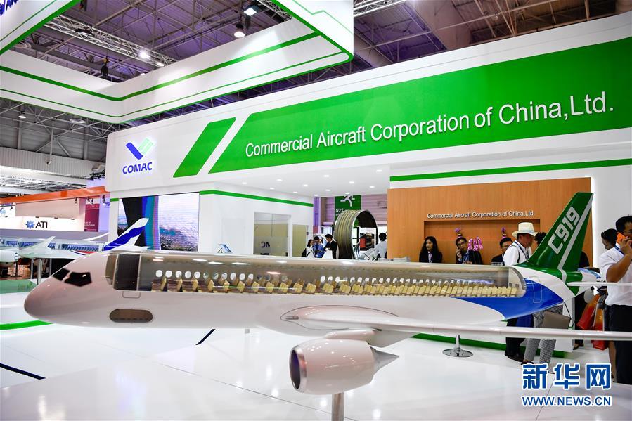 6月19日,在法国巴黎近郊的布尔歇,来宾参观中国商用飞机有限责任公司展出的C919客机模型。