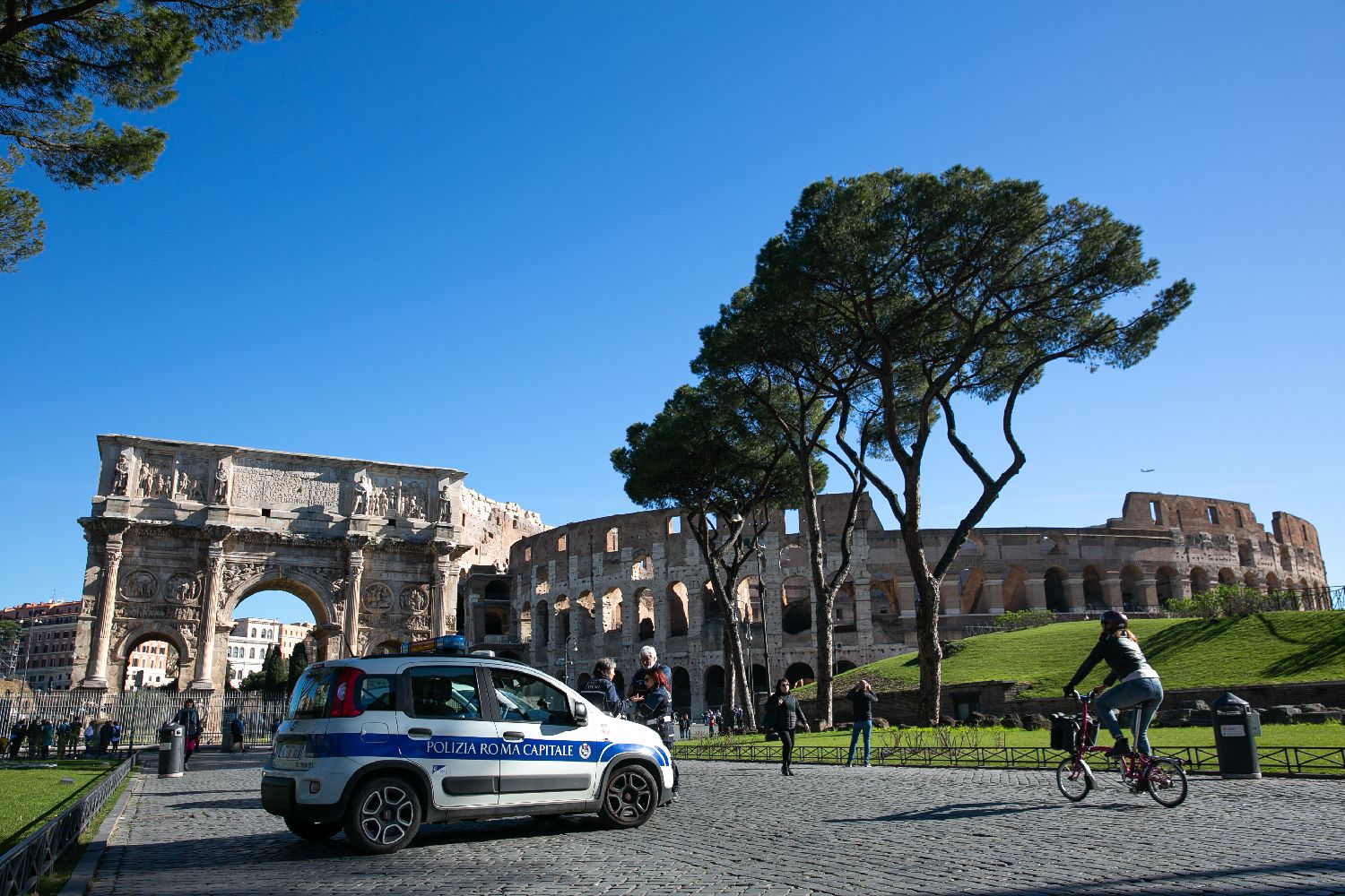 3月25日,警察在意大利罗马君士坦丁凯旋门和斗兽场附近执勤。