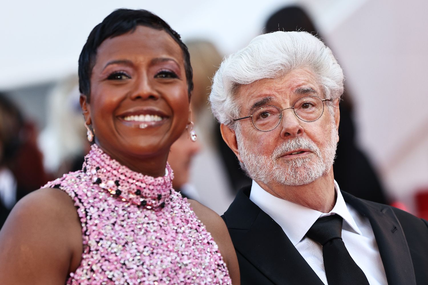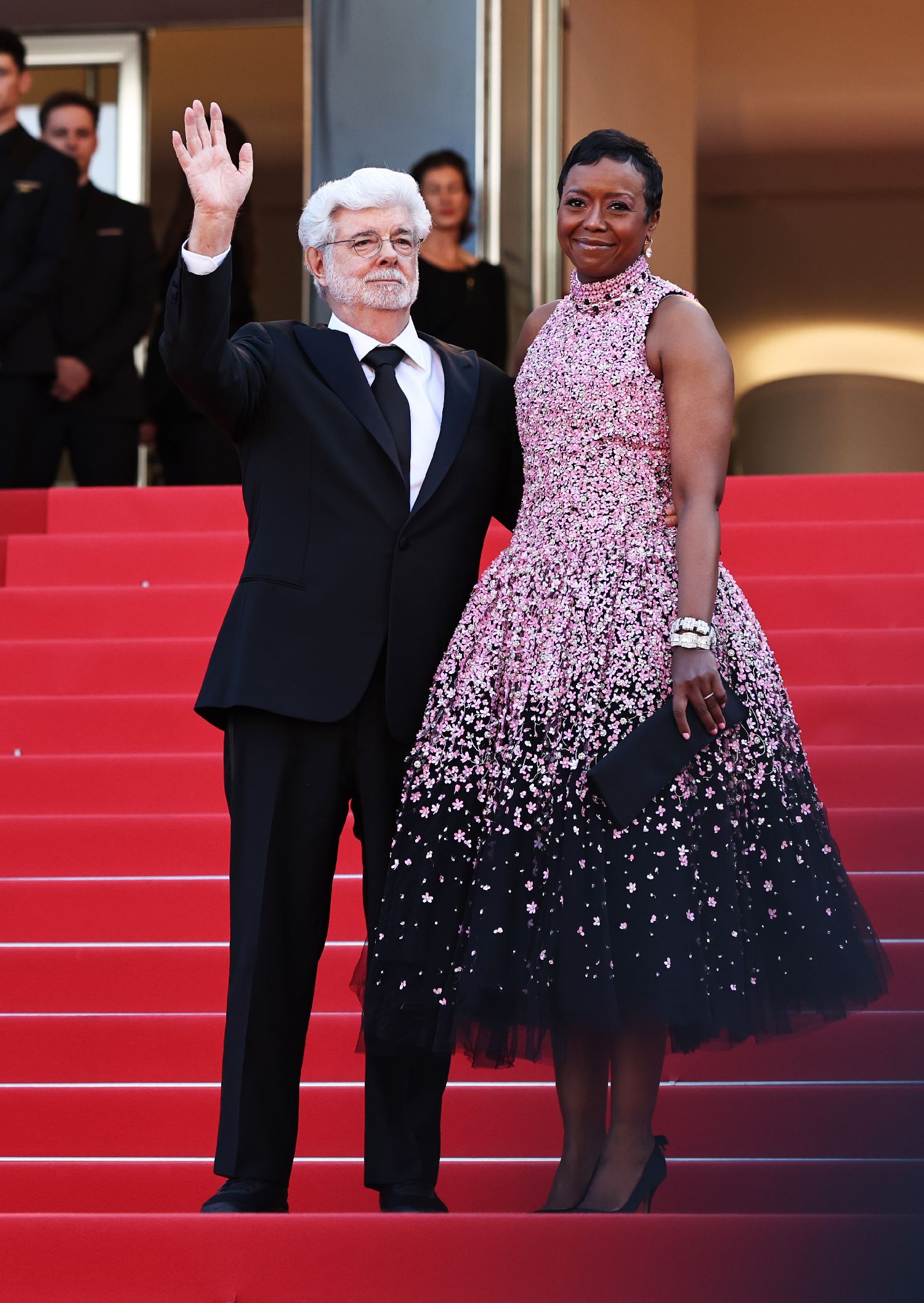 5月25日,在法国南部城市戛纳举行的第77届戛纳电影节上,美国导演、编剧、制片人乔治·卢卡斯(右)抵达闭幕式红毯。
