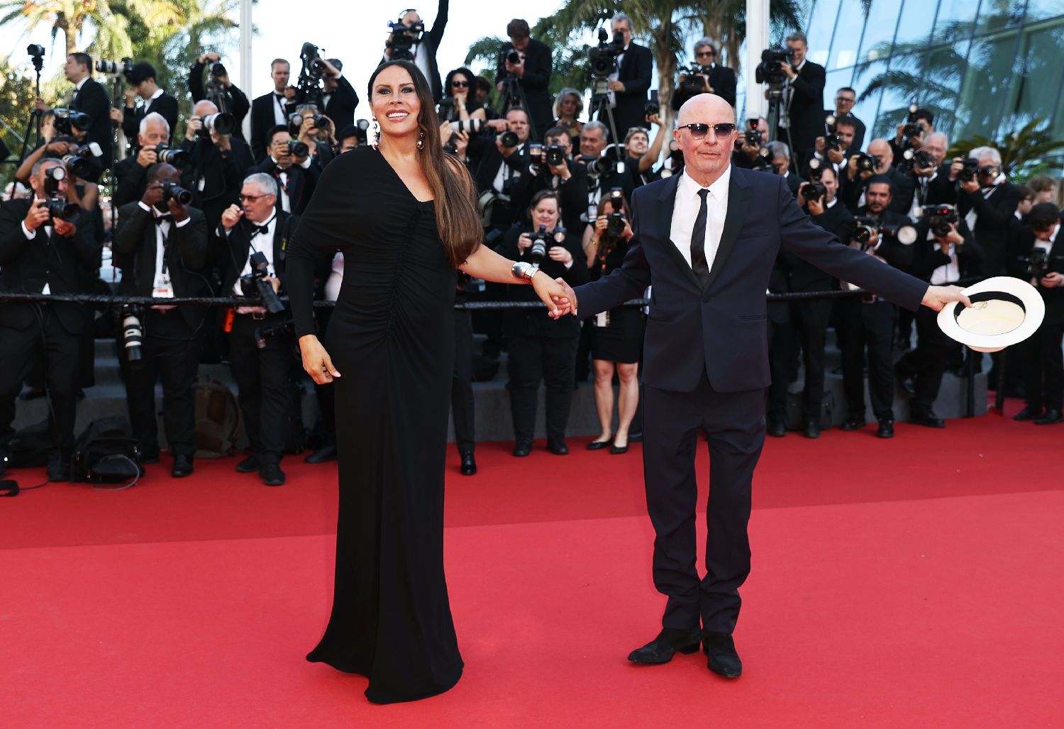 5月25日,在法国南部城市戛纳举行的第77届戛纳电影节上,演员卡拉·索菲亚·加斯孔(左)和法国导演雅克·奥迪亚尔抵达闭幕式红毯。