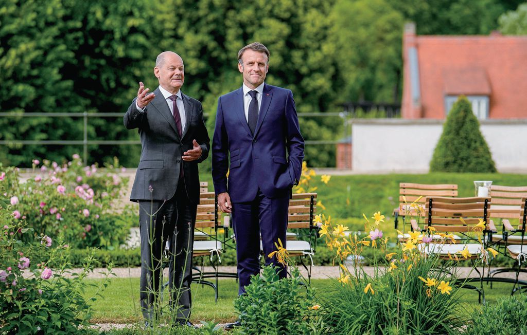 5月28日,德国总理朔尔茨(左)和法国总统埃马克龙(右)在德国东部柏林附近梅塞堡的梅塞堡宫举行法德部长联席会议前穿过花园。(图片来源:法新社)