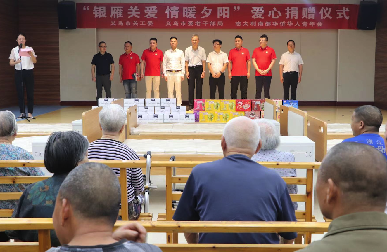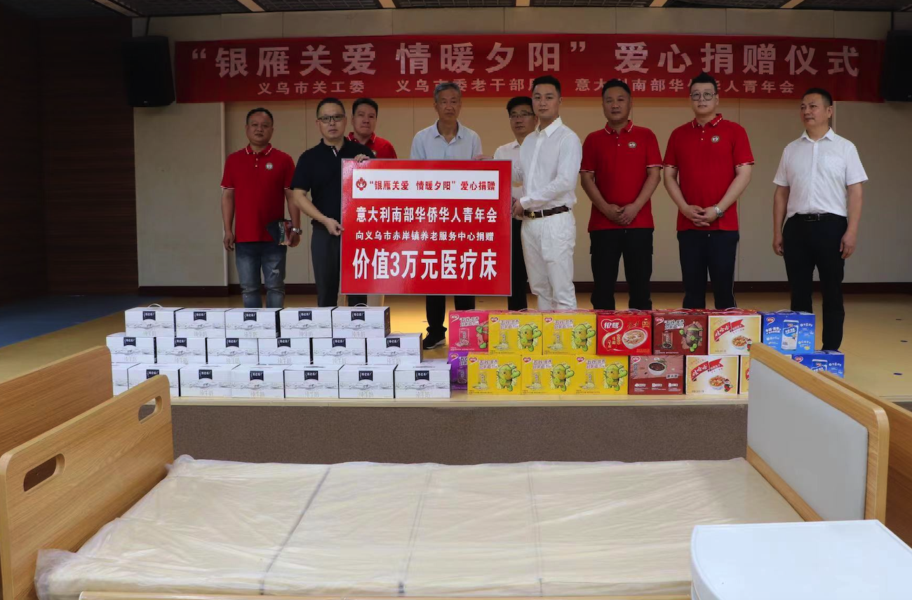 “银雁关爱 情暖夕阳”爱心捐赠活动上意大利南部华侨华人青年会向赤岸镇养老服务中心捐赠价值3万元医疗床以及慰问品。义乌市关工委主任吴伟兴、赤岸镇党委书记贾志建、人大副主席吴伟强、党委委员朱健等领导出席活动。