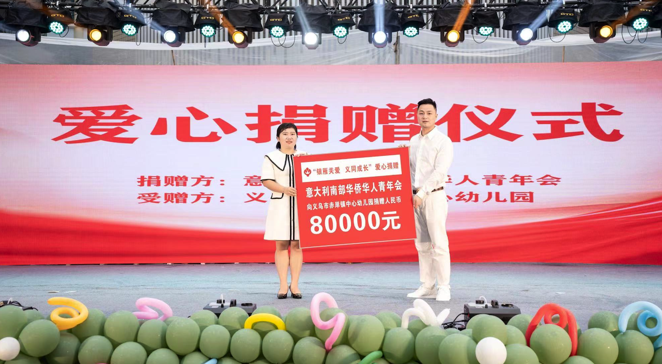 经市关工委牵线,意大利南部华侨华人青年会向赤岸镇中心幼儿园捐赠8万元爱心资金和价值1万元的爱心物资,在“银雁关爱 义同成长”爱心捐赠仪式上,意大利南部华侨华人青年会会长金建明与会嘉宾为小朋友代表颁发了毕生证书,孩子们怀着感激的心情为爱心人士送上亲手画的感谢信。义乌市关工委主任吴伟兴、赤岸镇党委书记贾志建、人大副主席吴伟强、党委委员朱健等领导出席活动。