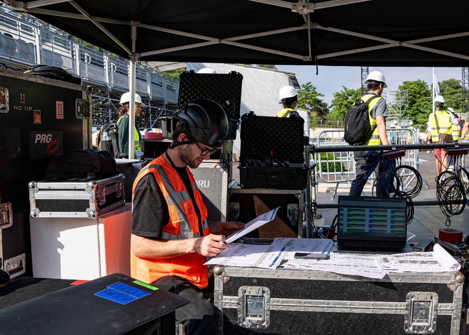 6月26日,在特罗卡德罗广场,工作人员正在查看图纸。