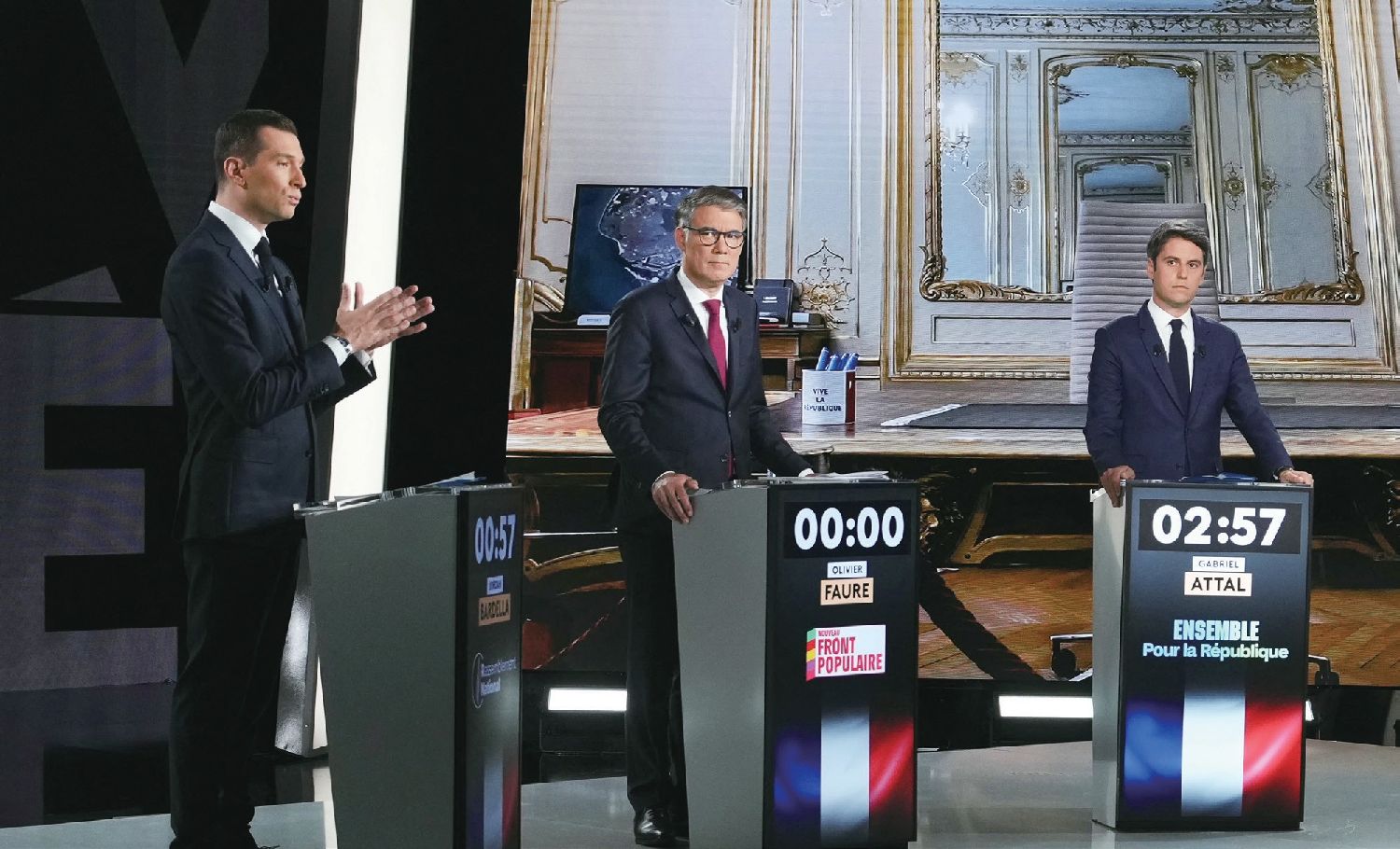 6月27日,法国极右翼政党国民联盟主席巴尔德拉(右),社会党第一书记福尔(中),执政党复兴党竞选牵头人、法国政府总理阿塔尔参加法国电视2台举办的电视辩论会。法新社图
