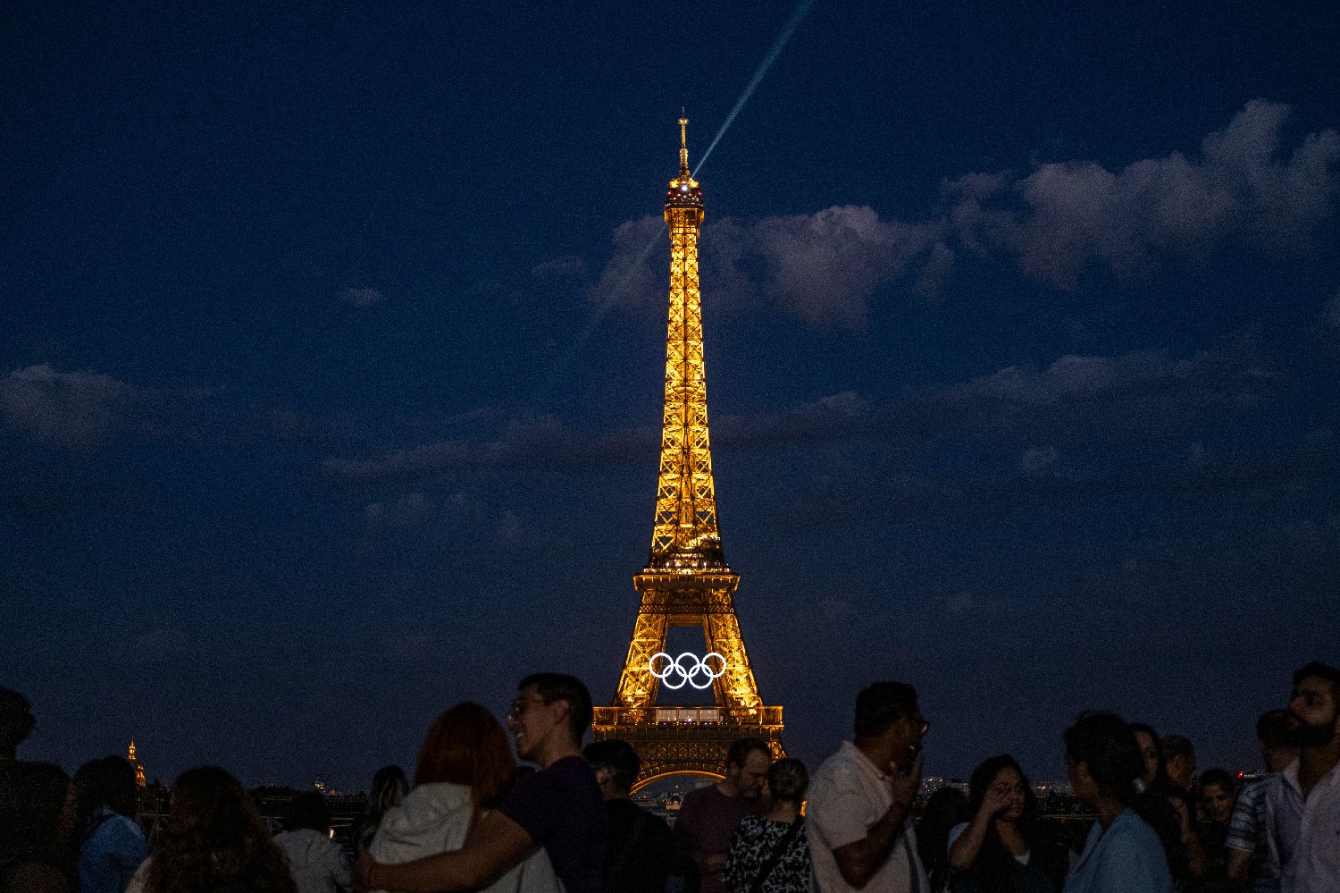 这是6月28日拍摄的悬挂奥运五环标志的埃菲尔铁塔。(图片来源:本文图片均据新华社)