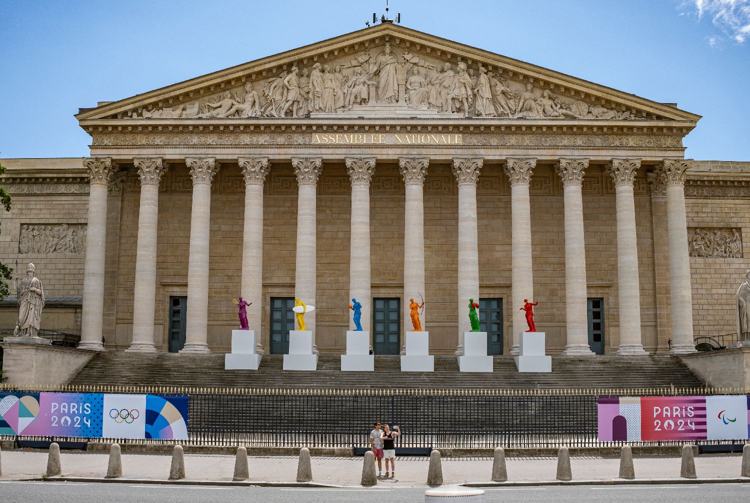 这是法国巴黎国民议会前的奥运主题雕像和景观装饰(6月28日摄)。