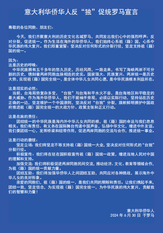 意大利《华人街》(孙玮报道):2024年6月30日,意大利“反独促统”2024高峰论坛罗马举行,并一致通过了“意大利华侨华人反'独'促统罗马宣言”。中国驻意大利大使馆李小勇公赞、中国统促会副秘书长许友滋,还有来自中国驻意大利使馆、中国驻米兰总领馆、中国驻佛罗伦萨总领馆领区侨团负责人一起参加论坛。