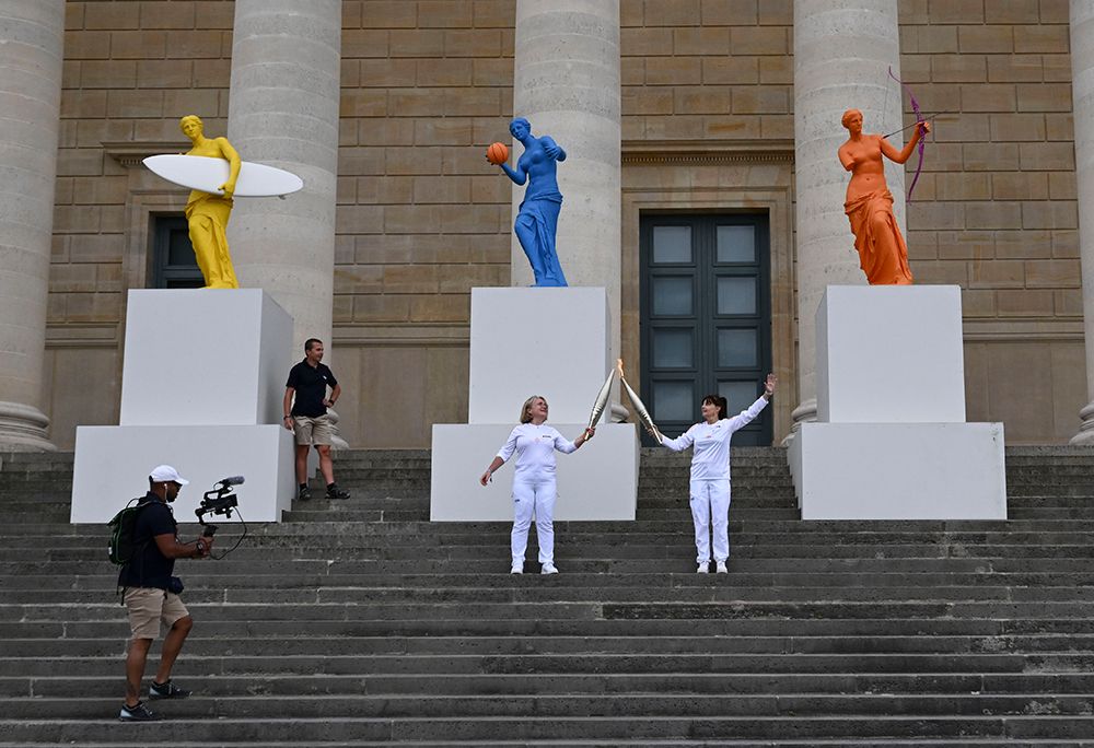 14日,在法国国民议会所在地——波旁宫,火炬手瓦莱丽·弗雷奥(右一)与火炬手维尔日妮·巴比内(右二)在传递圣火。当日,2024年巴黎奥运会火炬在巴黎开始为期两天的传递。