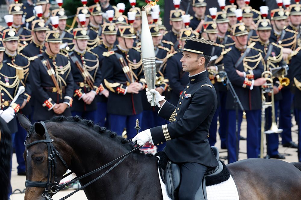 14日,在巴黎举行的法国国庆阅兵仪式上,2016年里约奥运会马术团体障碍赛冠军得主瓦莱特展示奥运火炬。