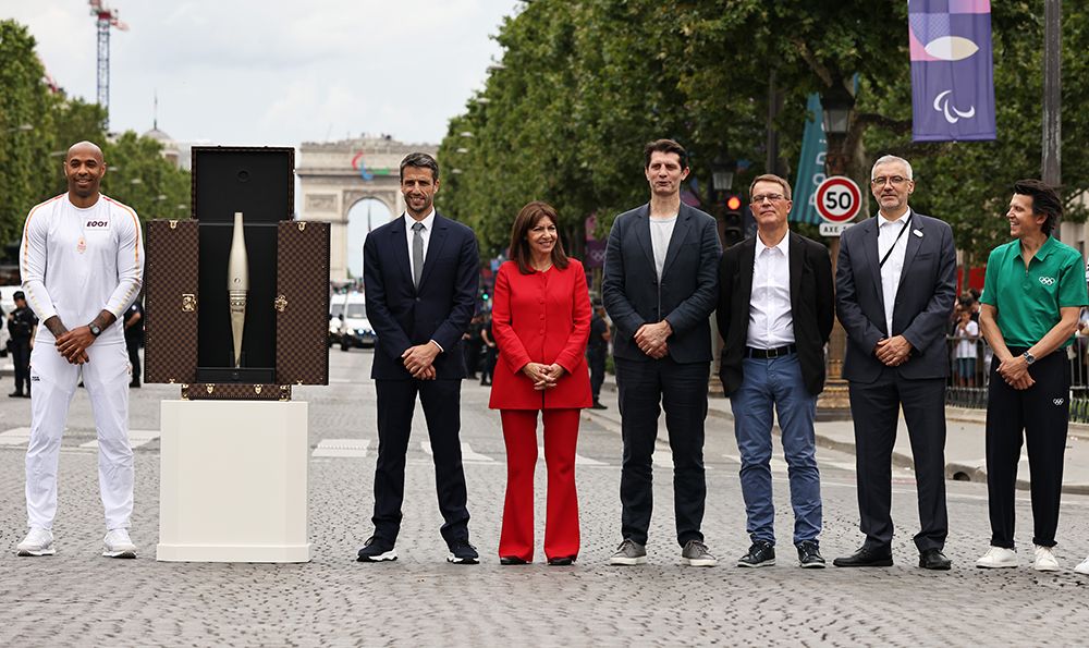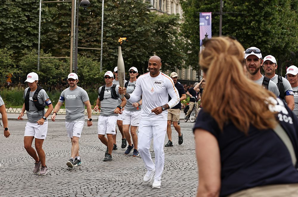7月14日,在法国巴黎香榭丽舍大街,第一棒火炬手、法国国奥队主教练、法国前足球运动员亨利(中)手持火炬传递。