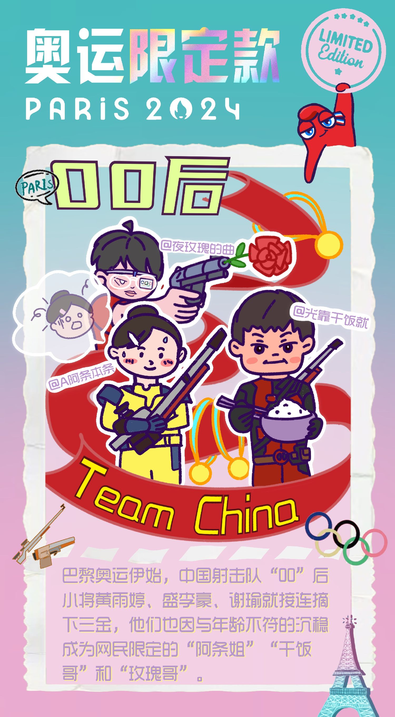 【欧洲时报网】28日结束的巴黎奥运会射击男子10米气手枪决赛中,中国选手、00年出生的谢瑜@夜玫瑰的曲获得冠军。他的网名引发关注,被网民称为“玫瑰哥”。此前,首金组合“阿条姐”黄雨婷@A阿条本条、“干饭哥”盛李豪@光靠干饭就、韩佳予@大_忍不了_真的忍不了了_绿、杜林澍@超级卡皮巴拉已经凭借网名走红,此外,“阿条姐”和“干饭哥”撞衫正在上映的漫威大片《死侍与金刚狼》也引发热议……网民:给世界一点中国00后的震撼!