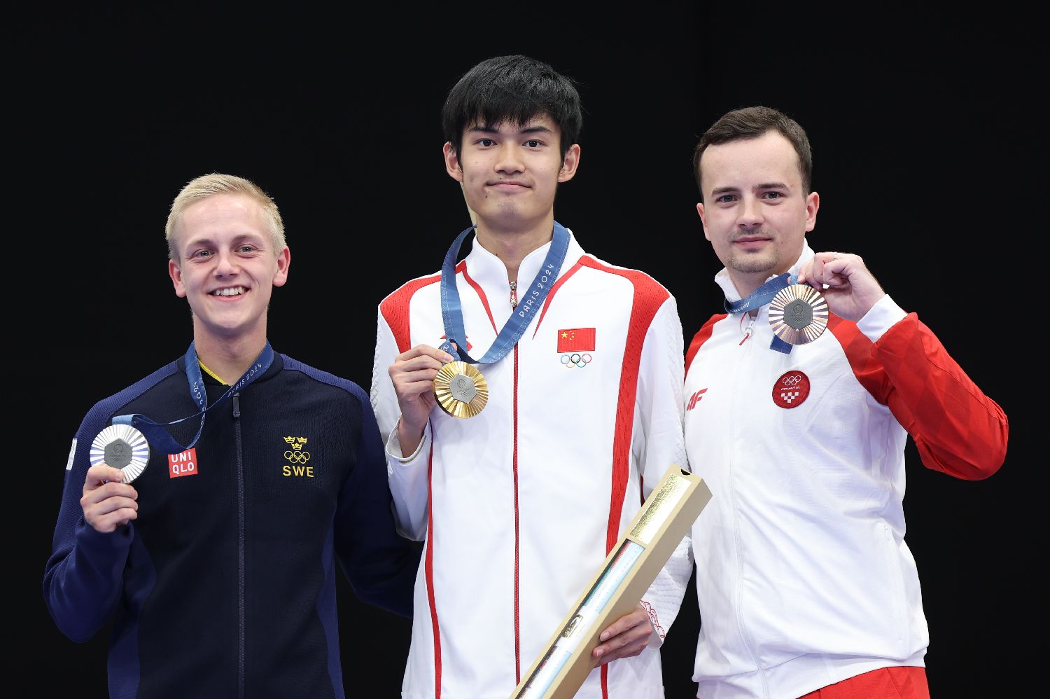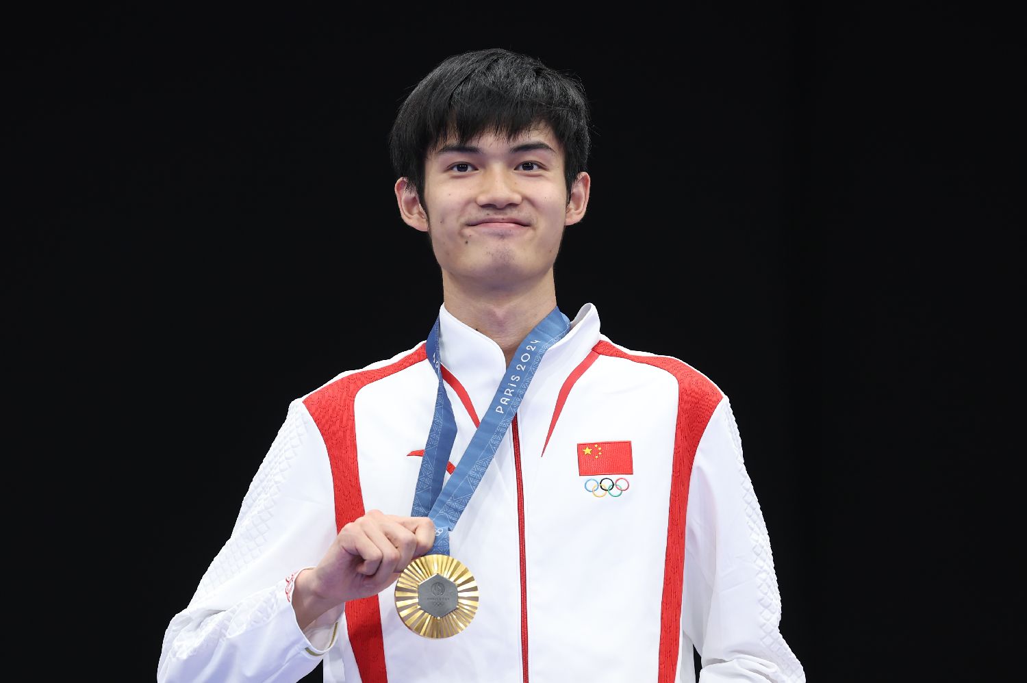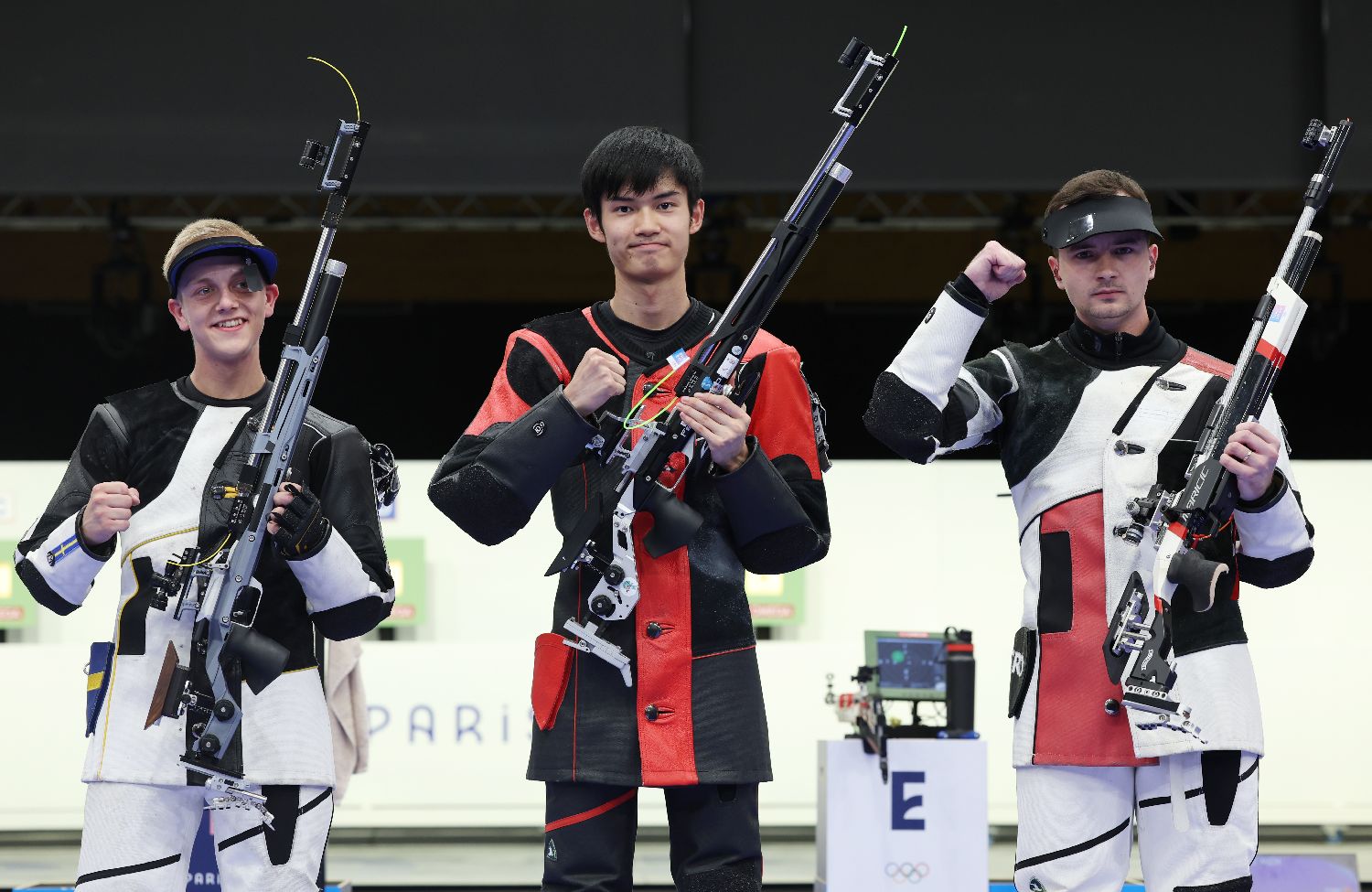 29日,在法国沙托鲁举行的巴黎奥运会射击男子10米气步枪决赛中,中国选手盛李豪获得冠军。图为盛李豪在颁奖仪式上。(图片来源:图片均据新华社)