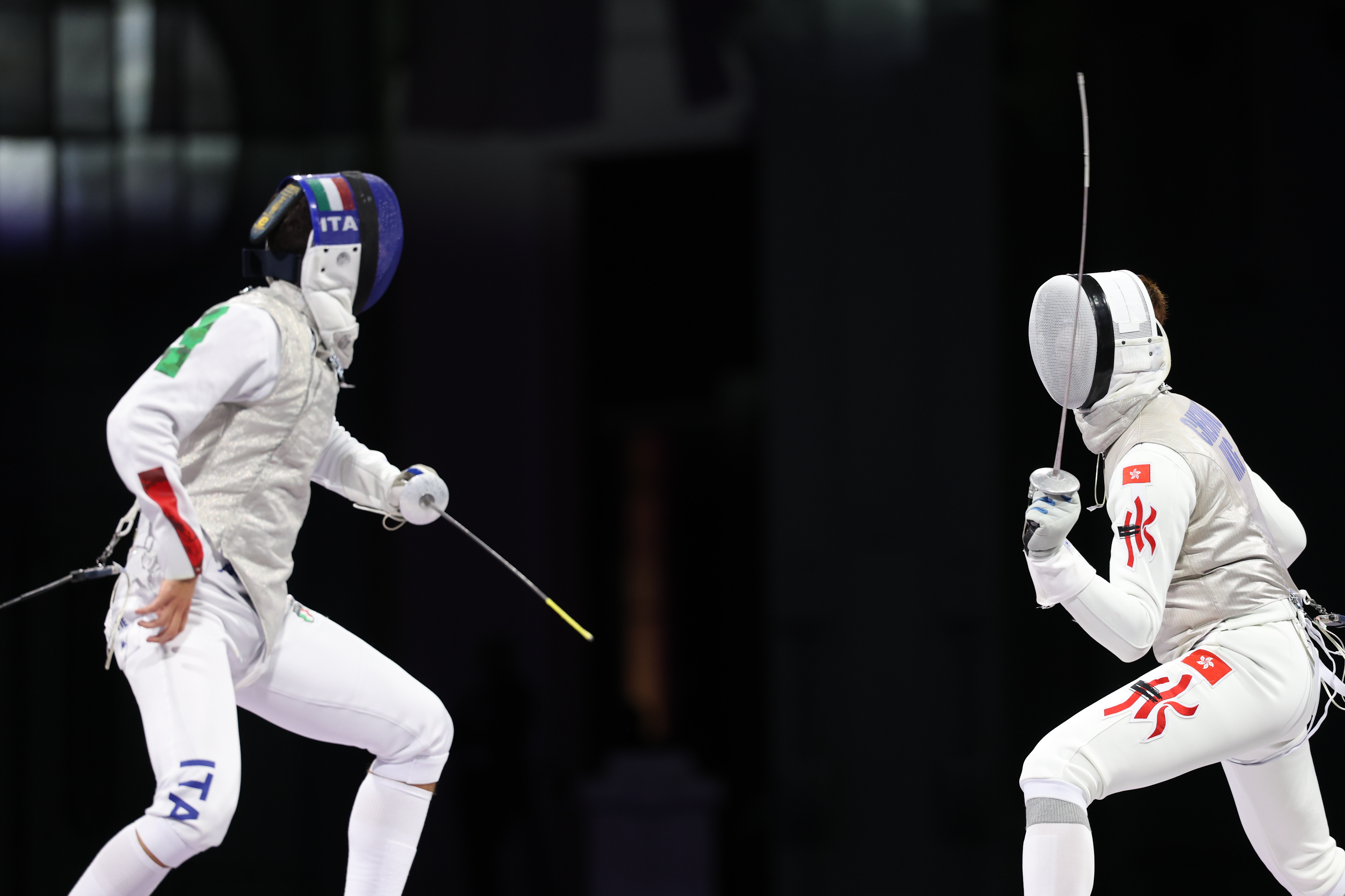 29日,在巴黎奥运会击剑男子个人花剑决赛中,中国香港选手张家朗战胜意大利选手马基获得金牌,成功卫冕。这也是中国香港代表团在巴黎奥运会的第二枚金牌。图为张家朗(右)在比赛中。(图片来源:图片均据中新社)