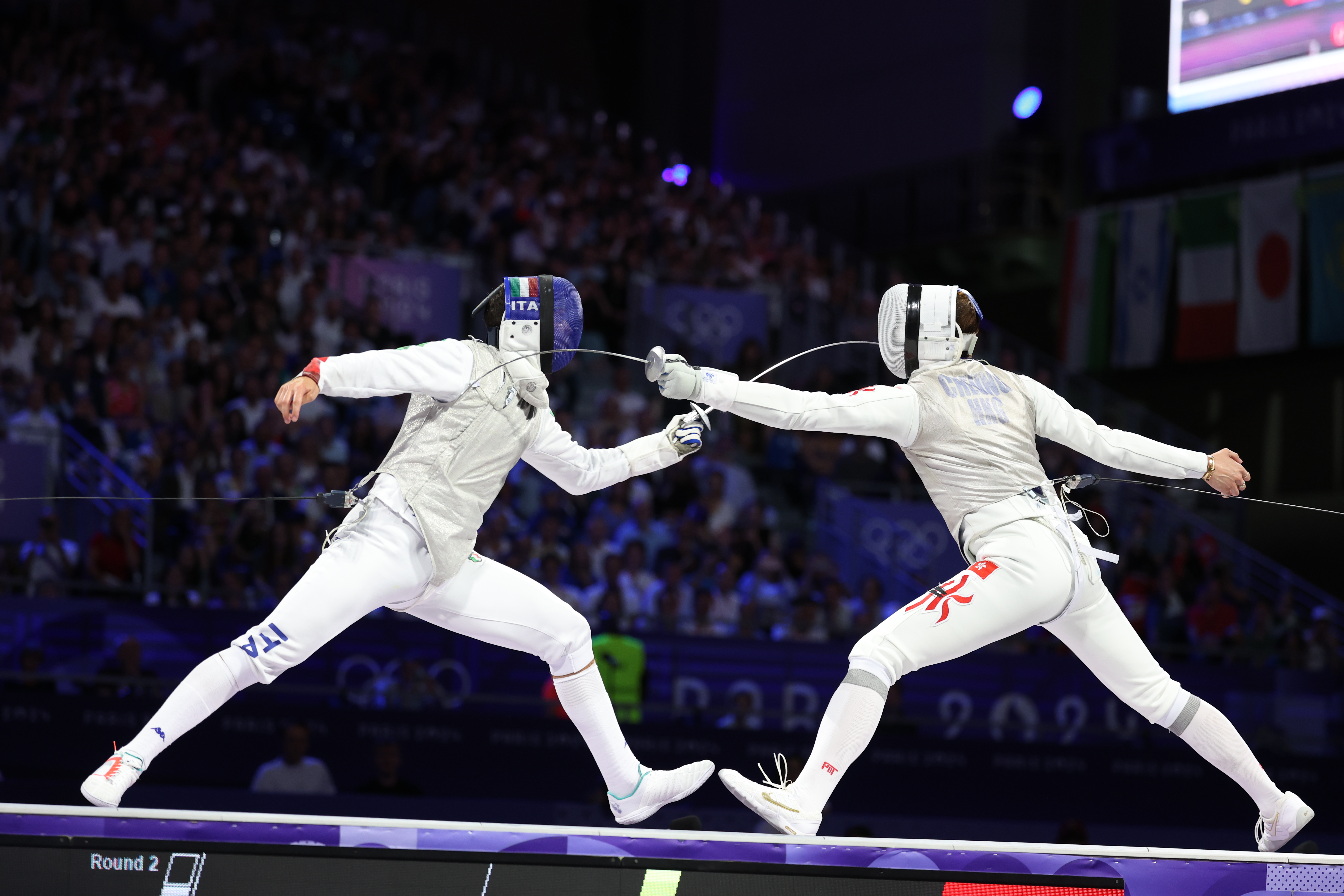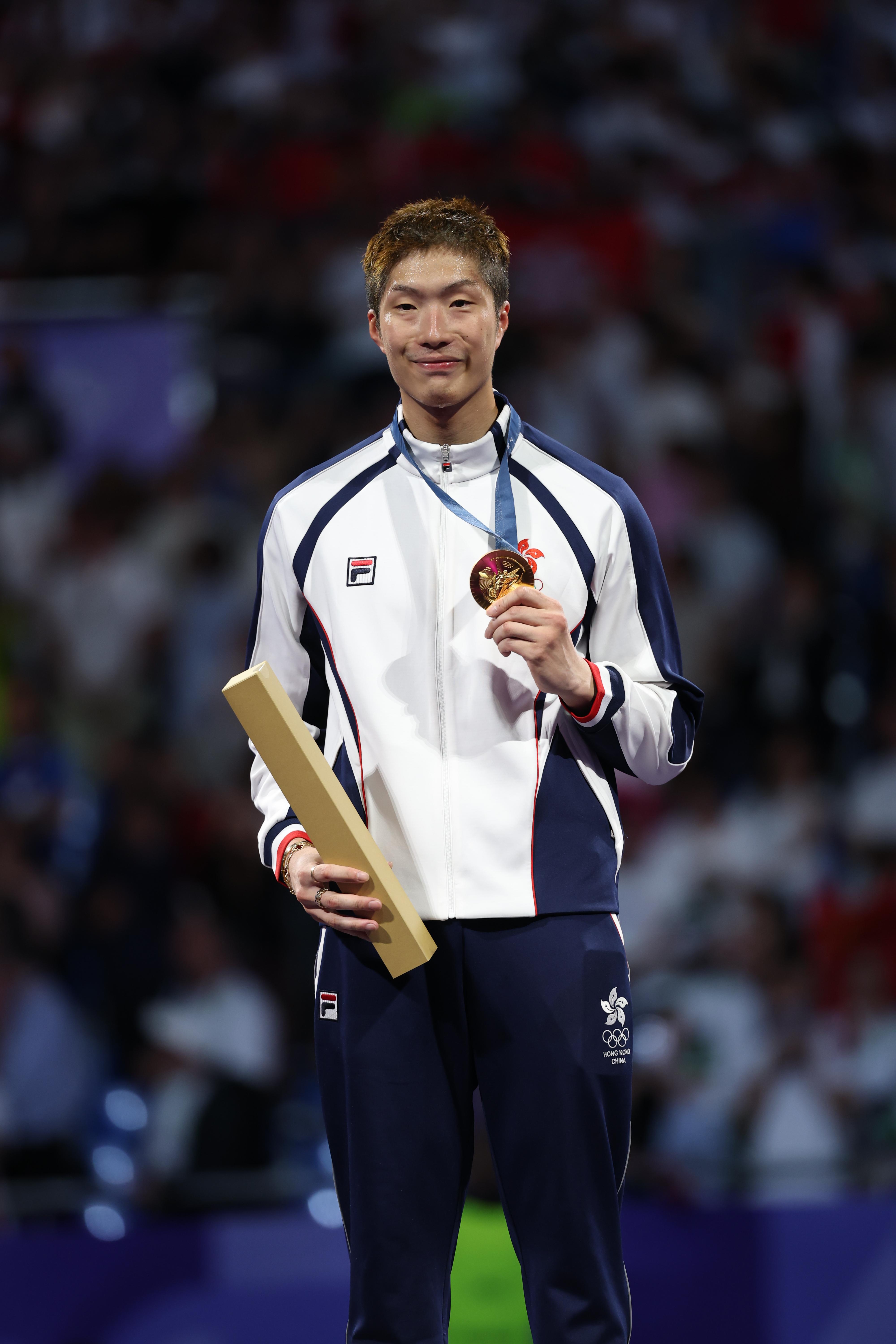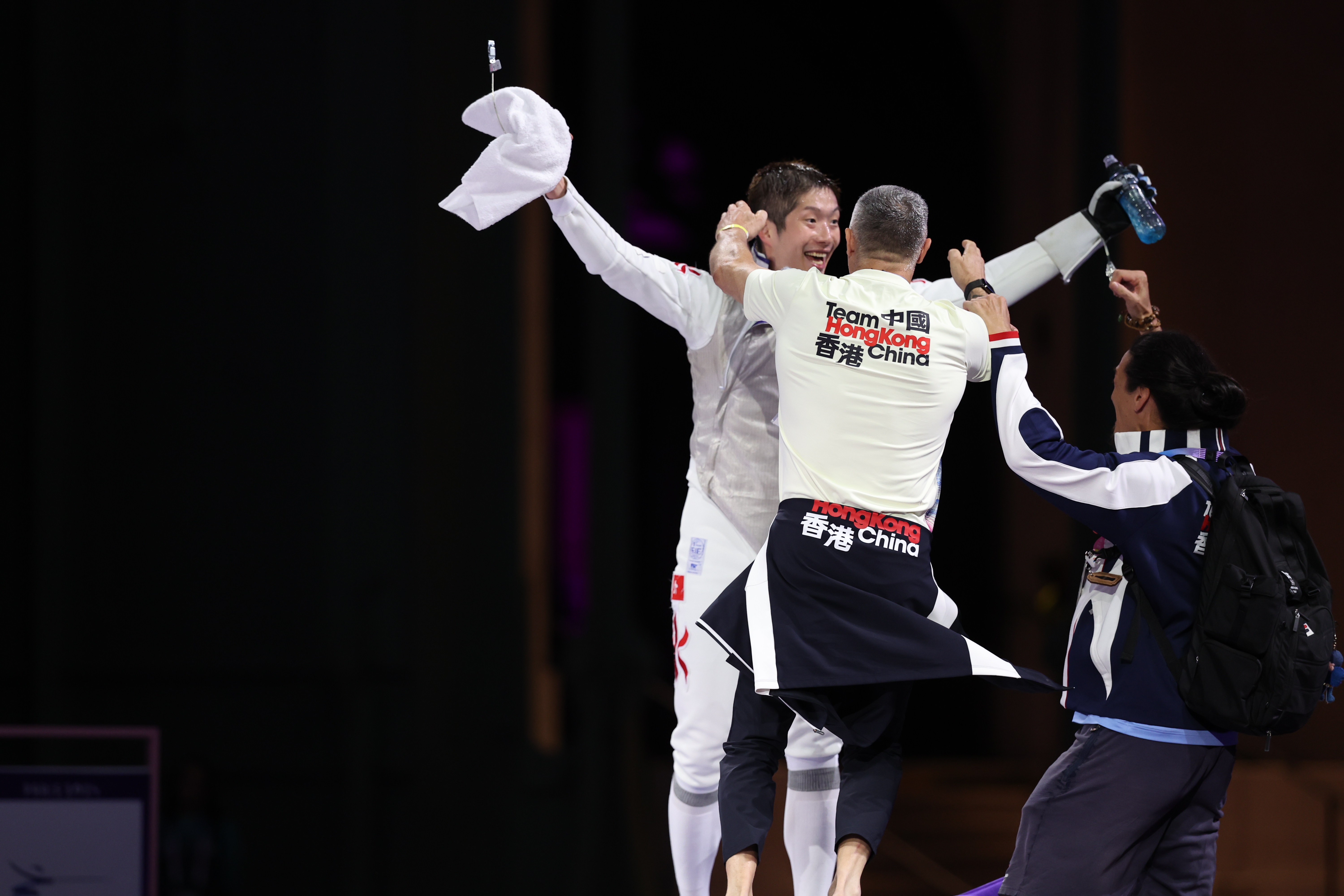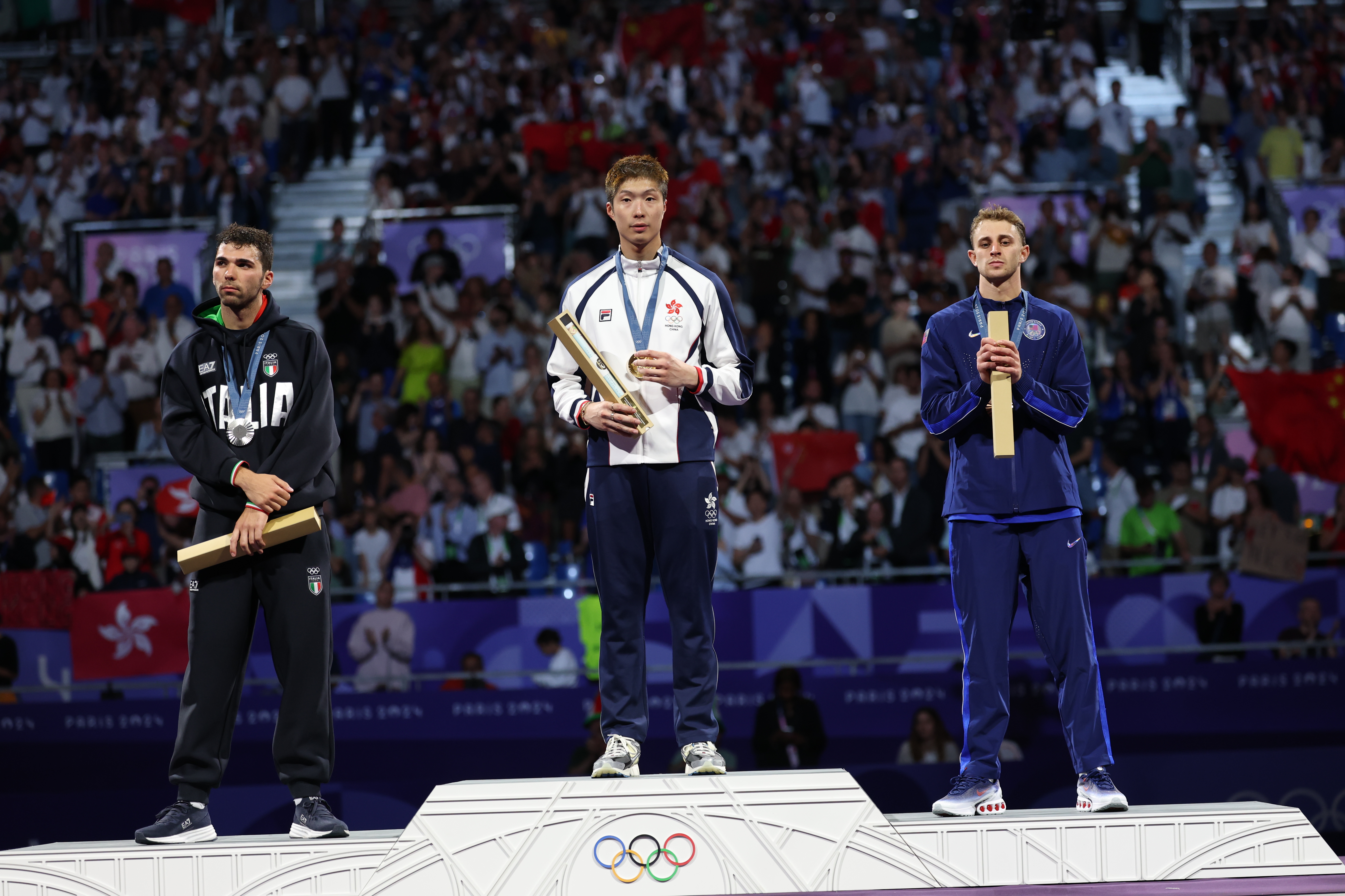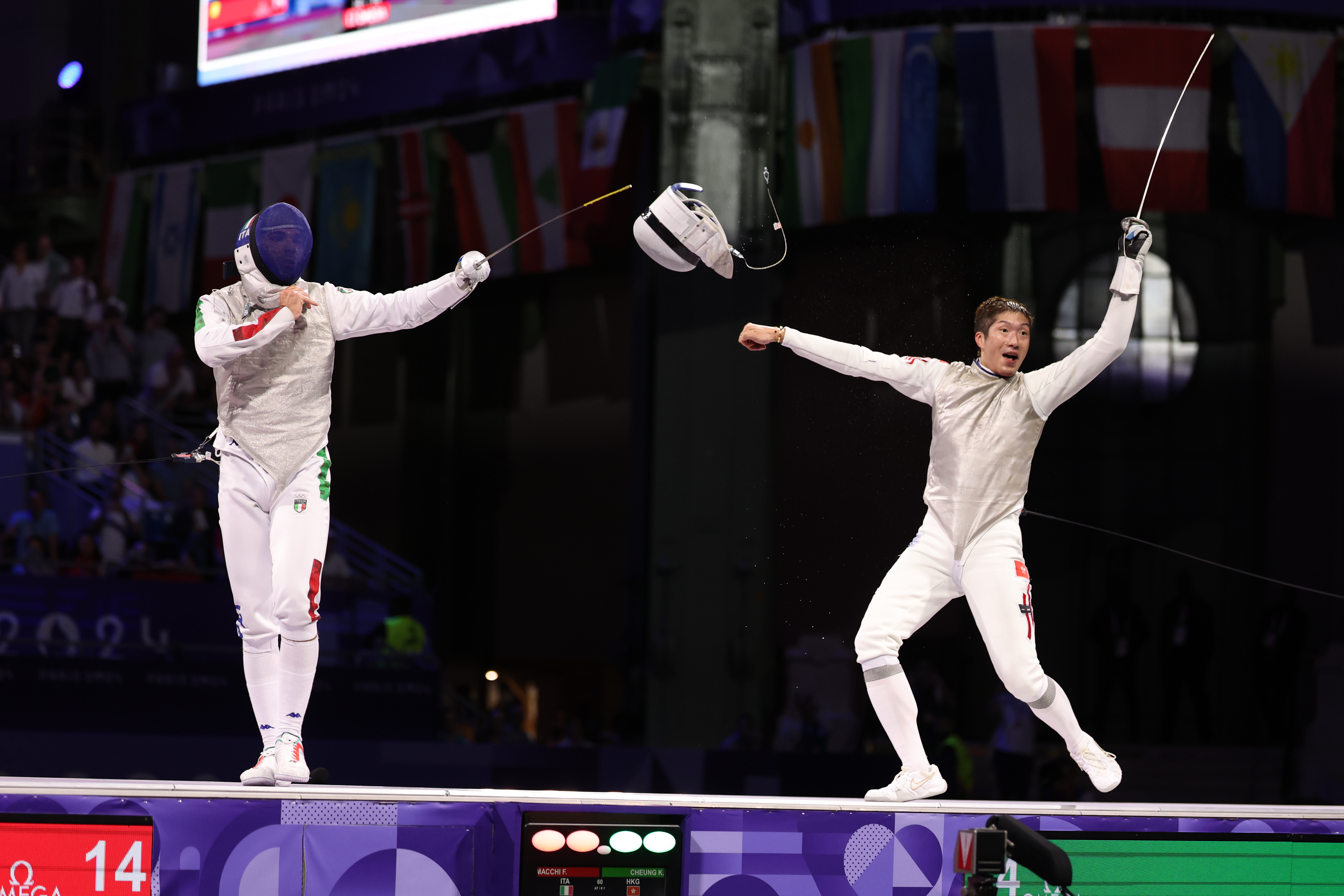 29日,在巴黎奥运会击剑男子个人花剑决赛中,中国香港选手张家朗战胜意大利选手马基获得金牌。