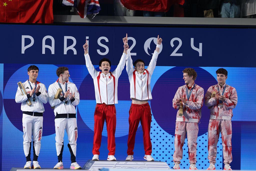 当地时间7月29日,在巴黎奥运会跳水男子双人10米台决赛中,中国选手杨昊/练俊杰夺得金牌。(图片来源:中新社)