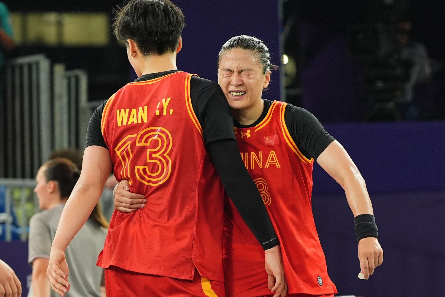 图为中国队球员王丽丽(右)和队友庆祝胜利。