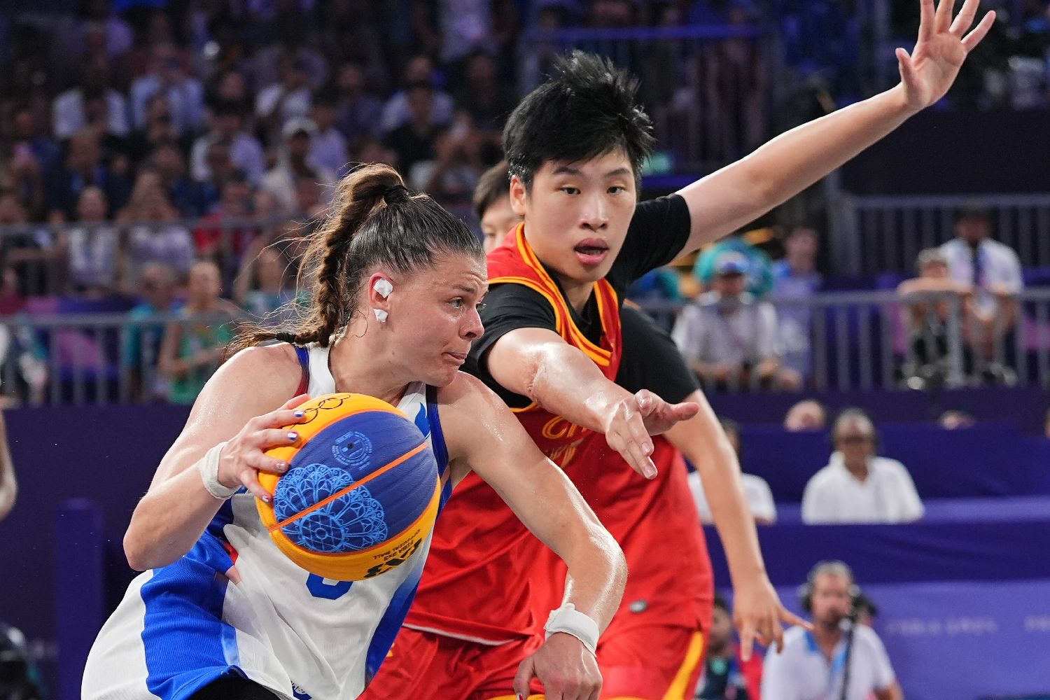 30日,在巴黎奥运会女子三人篮球的比赛中,中国队21比19击败法国队。图为中国队球员陈明伶(右)防守。(图片来源:图片均据中新社)