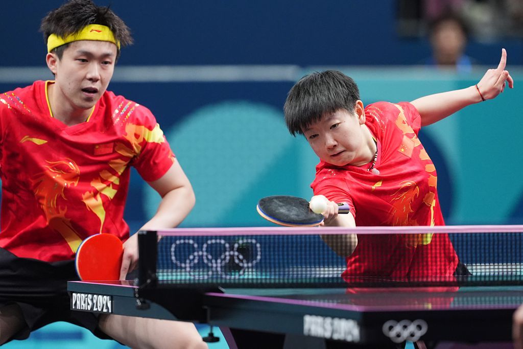 当地时间7月30日,在巴黎奥运会乒乓球混合双打决赛中,中国组合王楚钦/孙颖莎以4:2战胜朝鲜组合李正植/金琴英,为中国乒乓球队赢得首枚混双奥运金牌。图为王楚钦(左)和孙颖莎在比赛中。(图片来源:中新社)