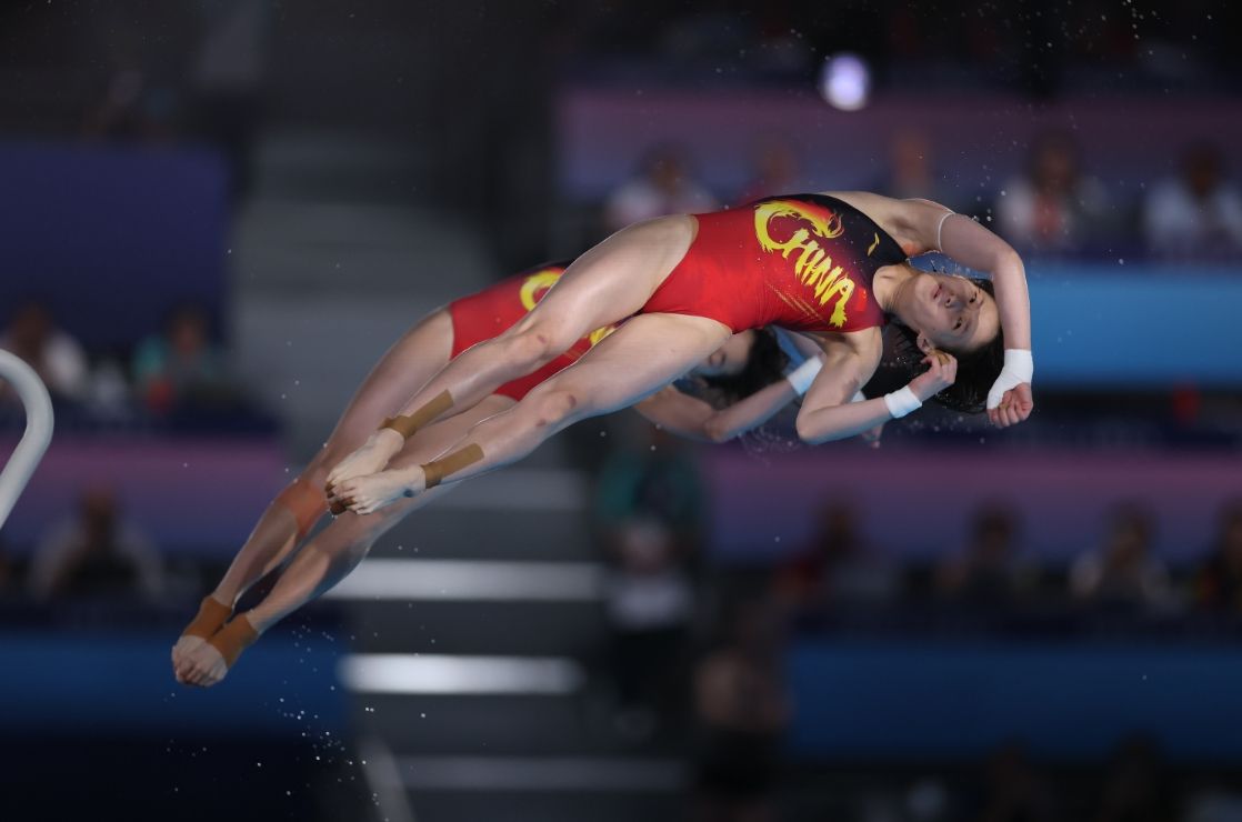 31日,在巴黎奥运会跳水女子双人10米台项目中,中国队组合陈芋汐/全红婵获得冠军。(图片来源:中新社)