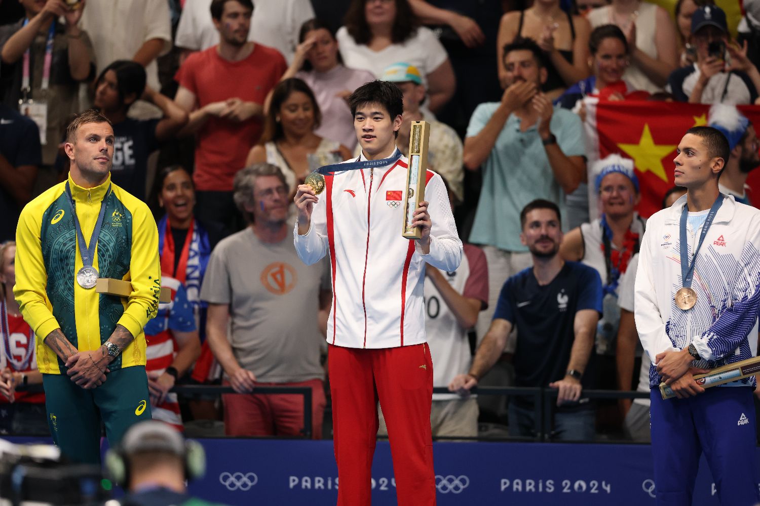 31日,在巴黎奥运会游泳男子100米自由泳决赛中,中国选手潘展乐以46秒40的成绩打破世界纪录,夺得金牌。图为冠军中国选手潘展乐(中)、亚军澳大利亚选手查默斯(左)与季军罗马尼亚选手波波维奇在颁奖仪式上。(图片来源:中新社)
