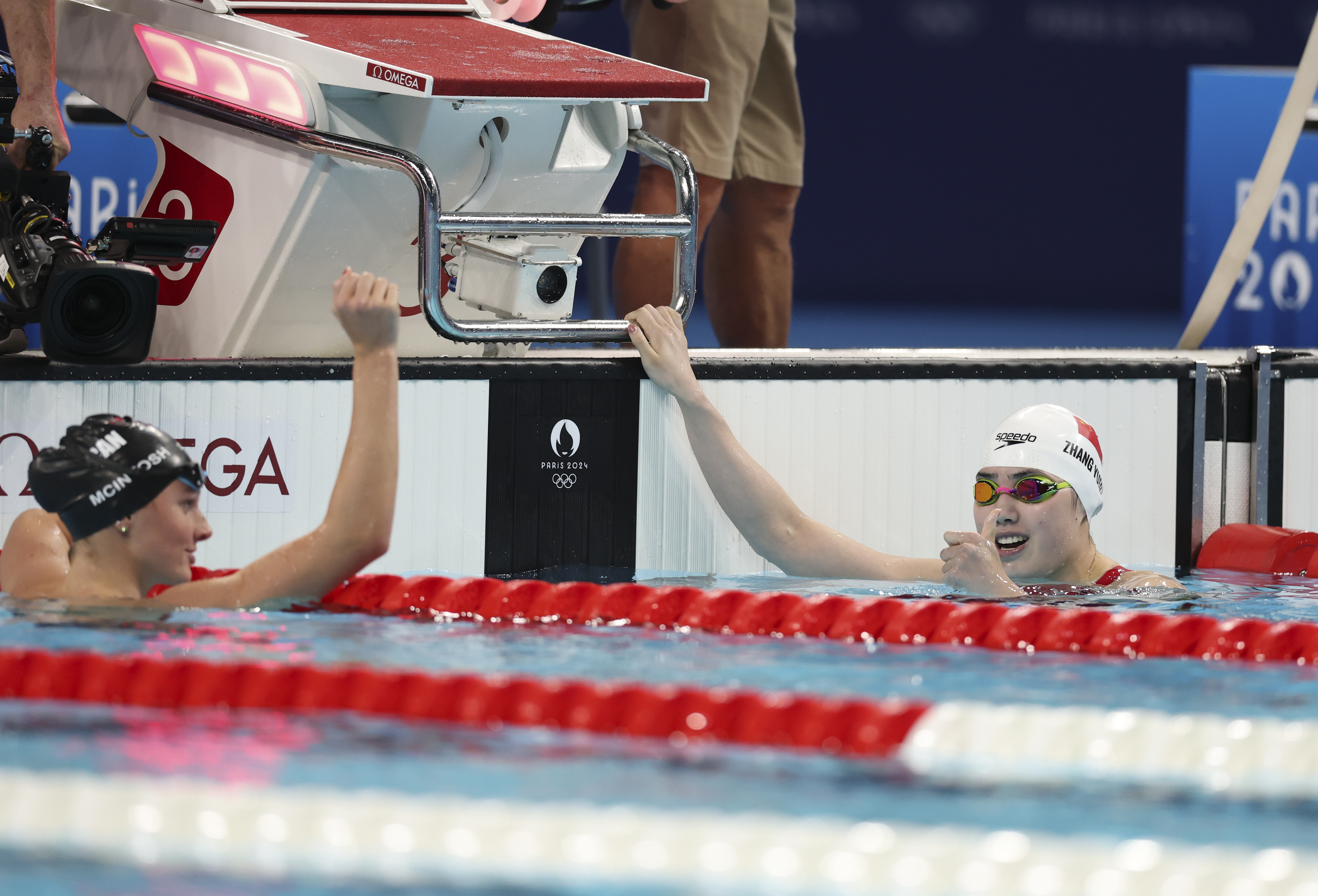 图为张雨霏(右)祝贺加拿大选手麦金托什夺冠。