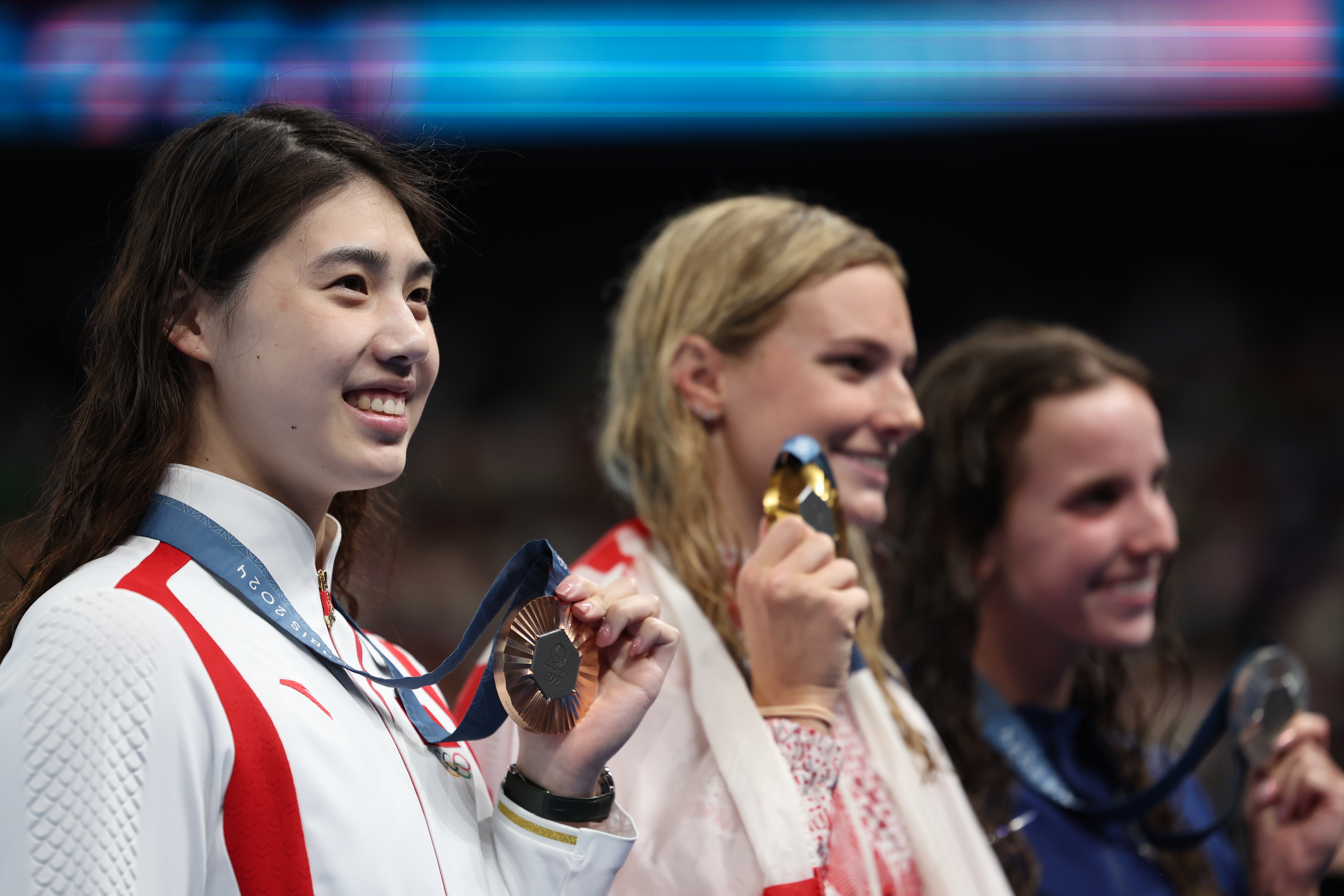 1日,在巴黎奥运会女子200米蝶泳决赛中,中国选手张雨霏(左)以2分05秒09的成绩获得铜牌。加拿大名将麦金托什(中)以打破奥运纪录的2分03秒03获得金牌,美国选手史密斯(右)游出2分03秒84获得银牌。(图片来源:图片均据中新社)