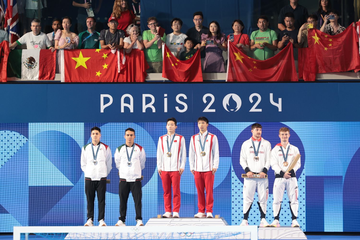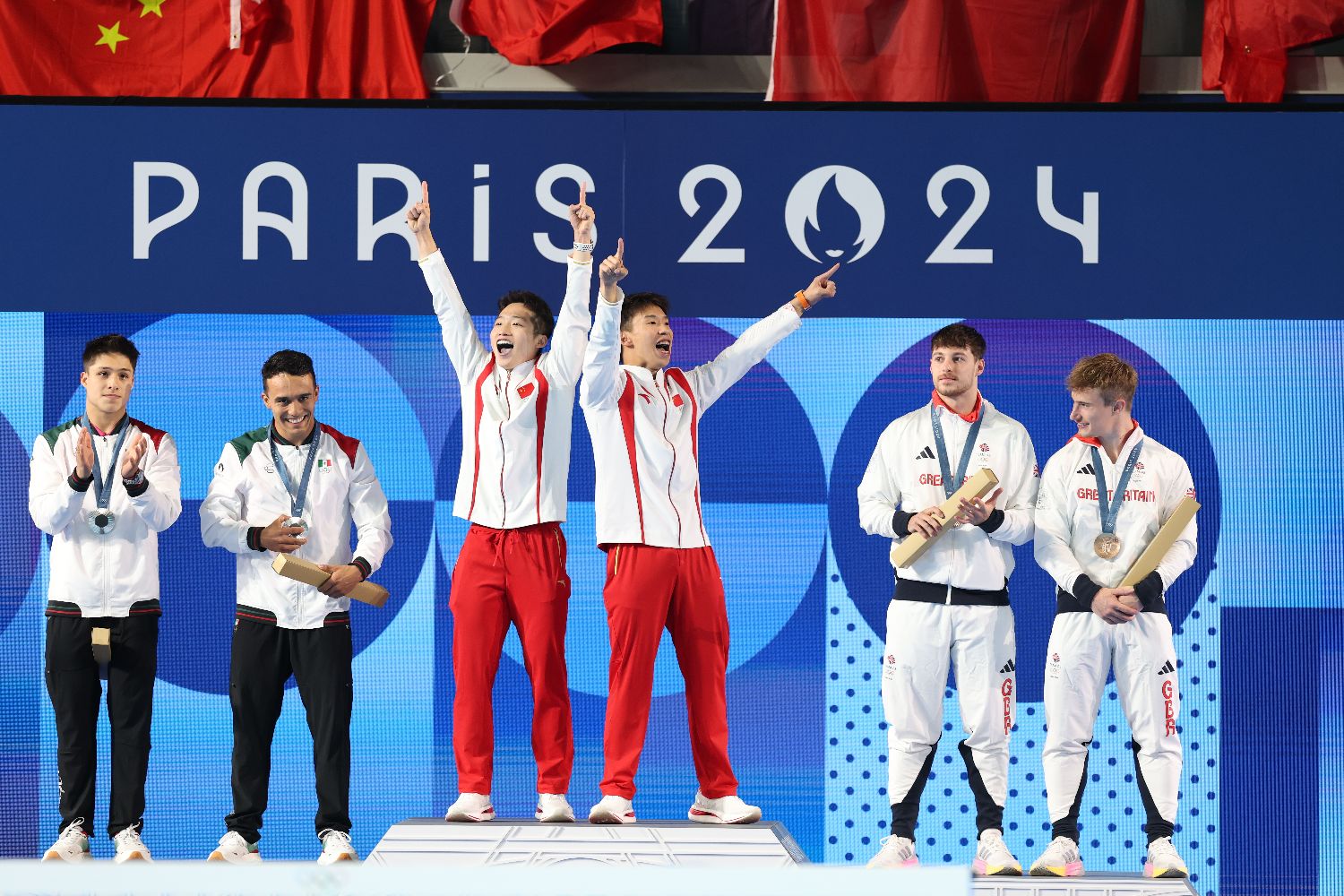 2日,在巴黎奥运会跳水男子双人3米板决赛中,中国组合王宗源/龙道一夺得金牌。这不仅是中国跳水队摘得的第四金,也是中国体育代表团在本届奥运会上获得的第12枚金牌。图为龙道一/王宗源在颁奖仪式上。(图片来源:图片均据中新社)