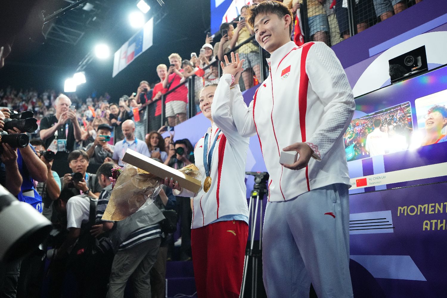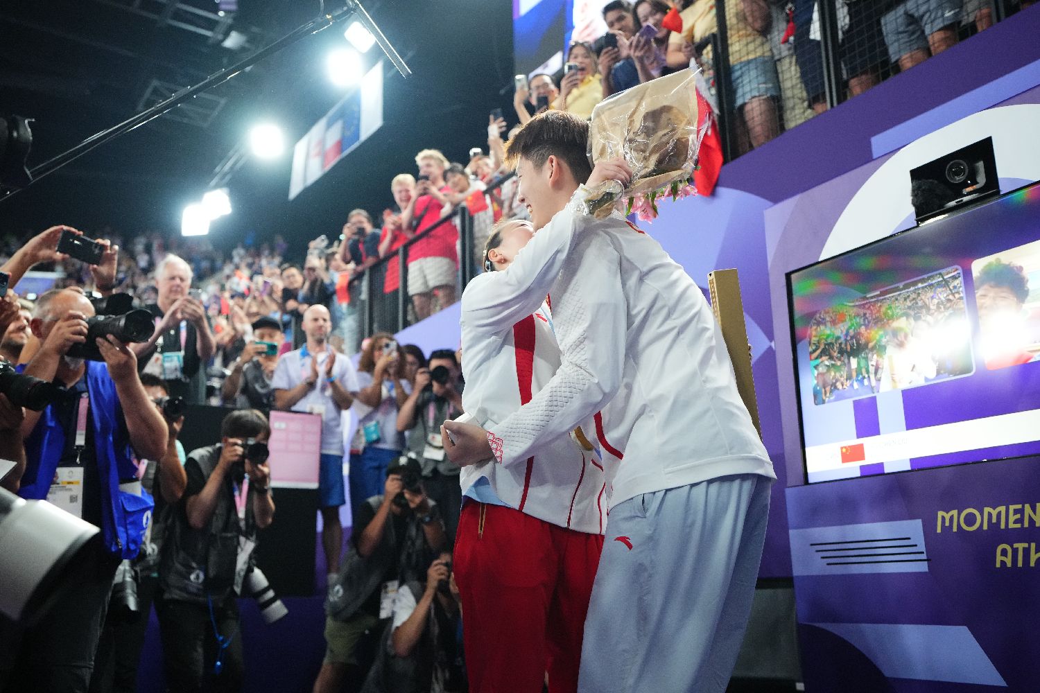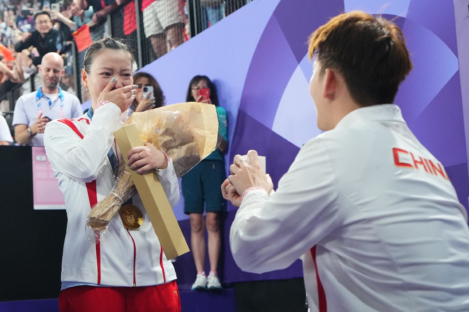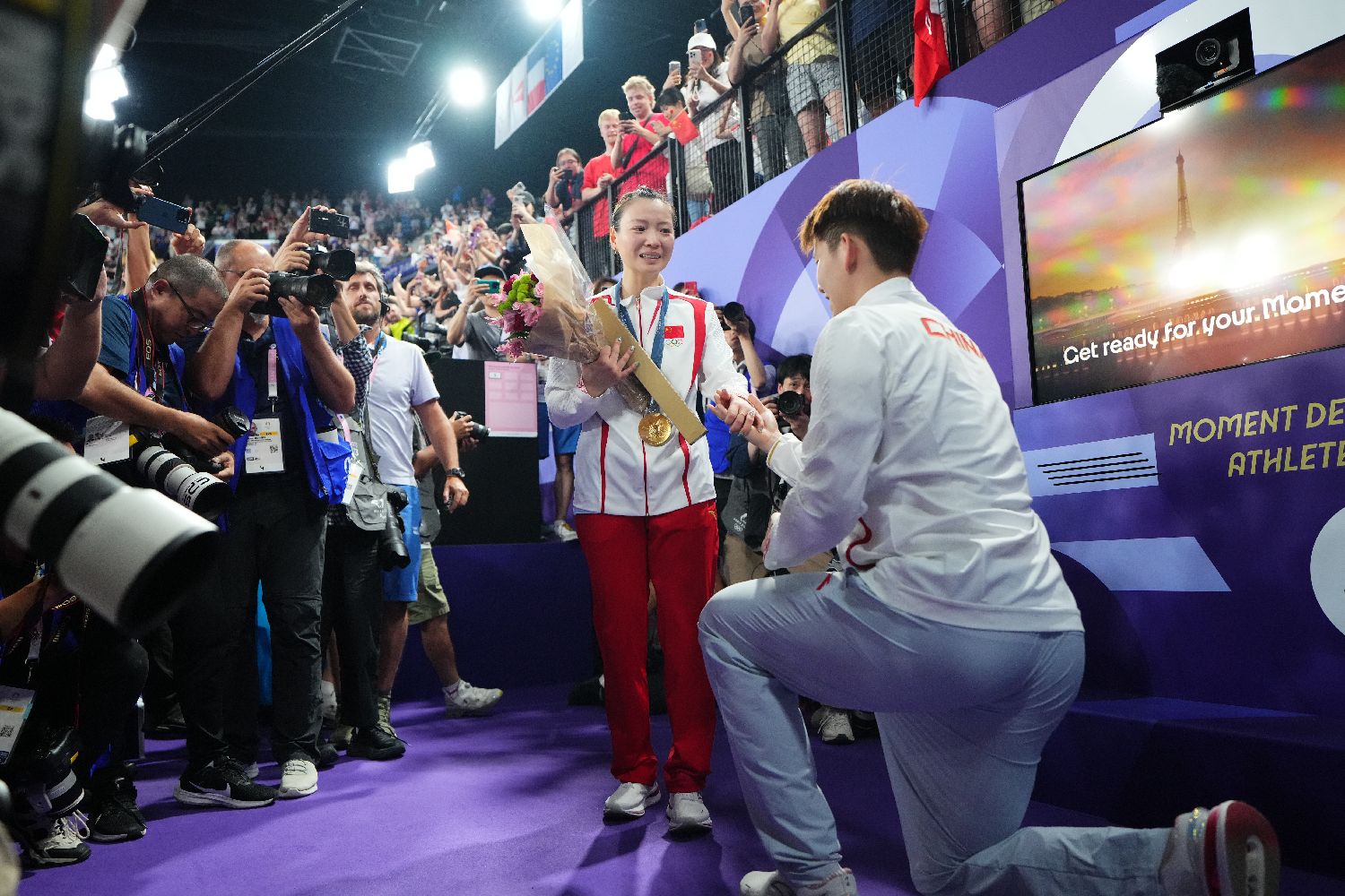 2日,在巴黎奥运会羽毛球混合双打决赛中,中国组合郑思维/黄雅琼以2比0胜韩国组合金元昊/郑娜银,获得金牌。图为颁奖仪式结束后,中国羽毛球队队员刘雨辰向黄雅琼求婚。(图片来源:图片均据中新社)