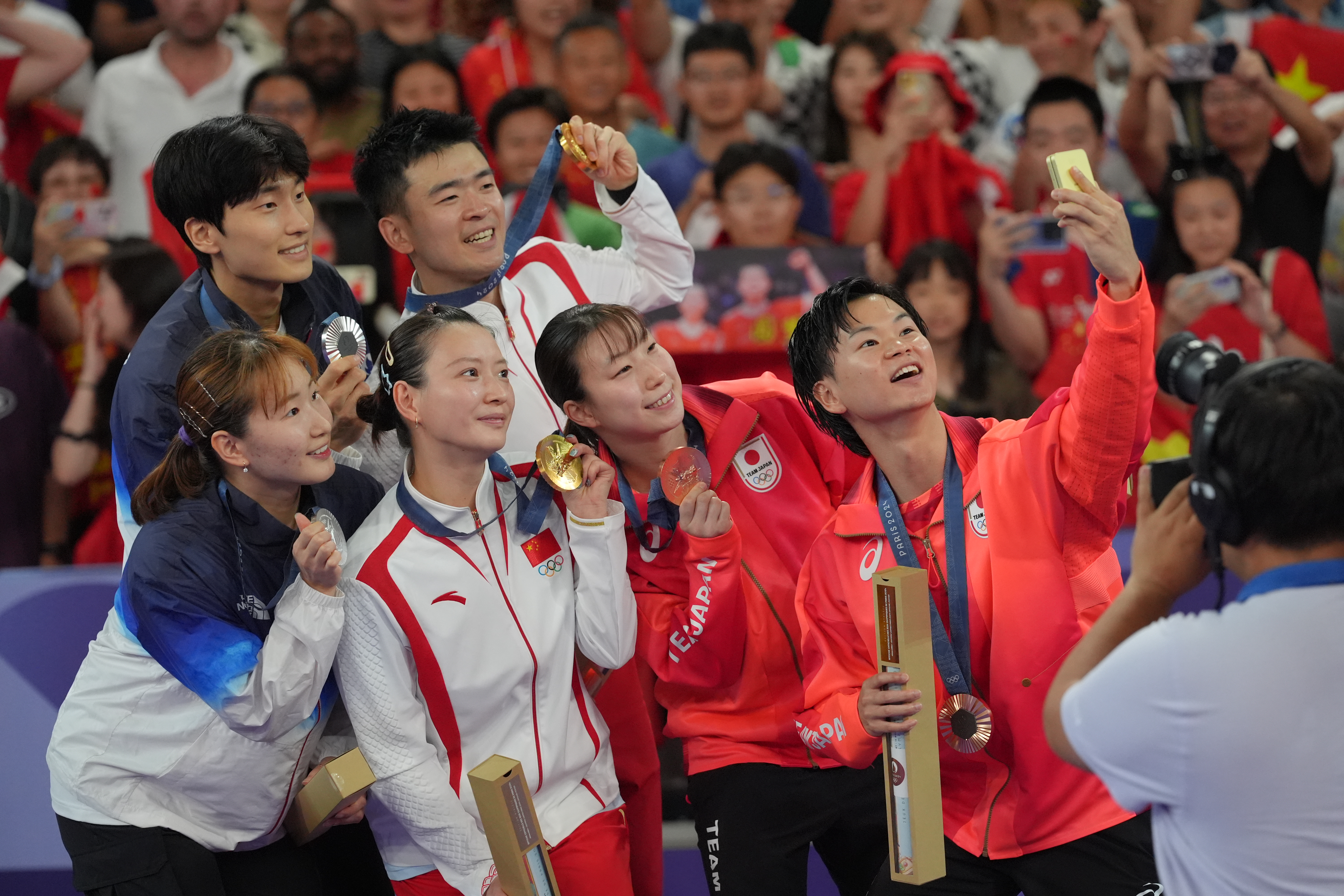 图为获奖运动员在颁奖仪式上自拍。